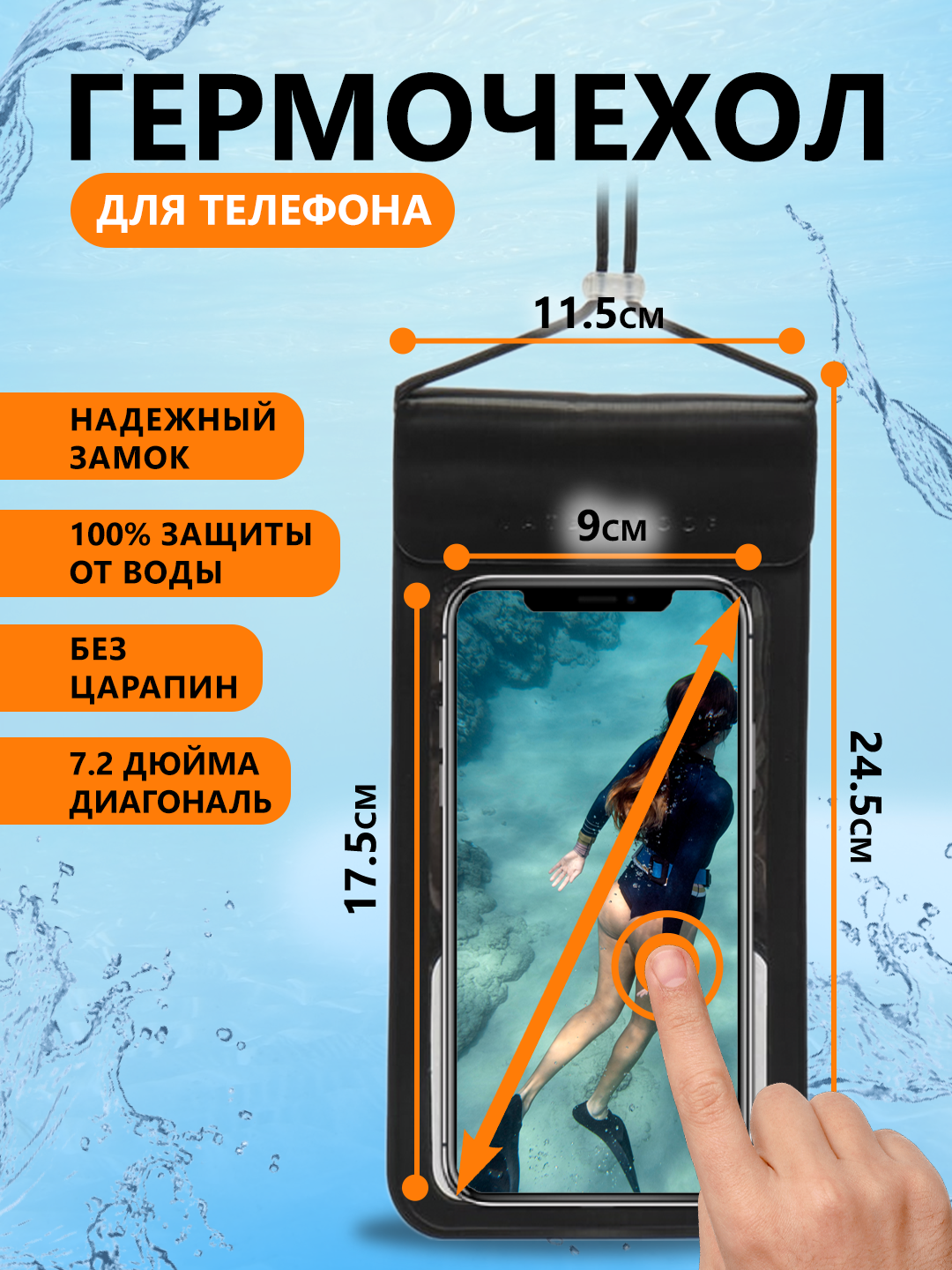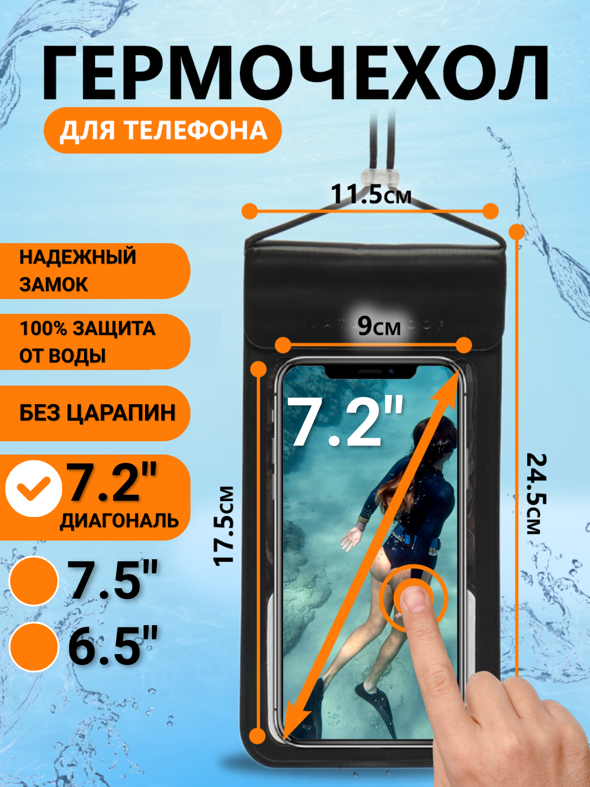 Водонепроницаемый чехол для телефонов под водой на шею / гермочехол до 7,2" дюйма