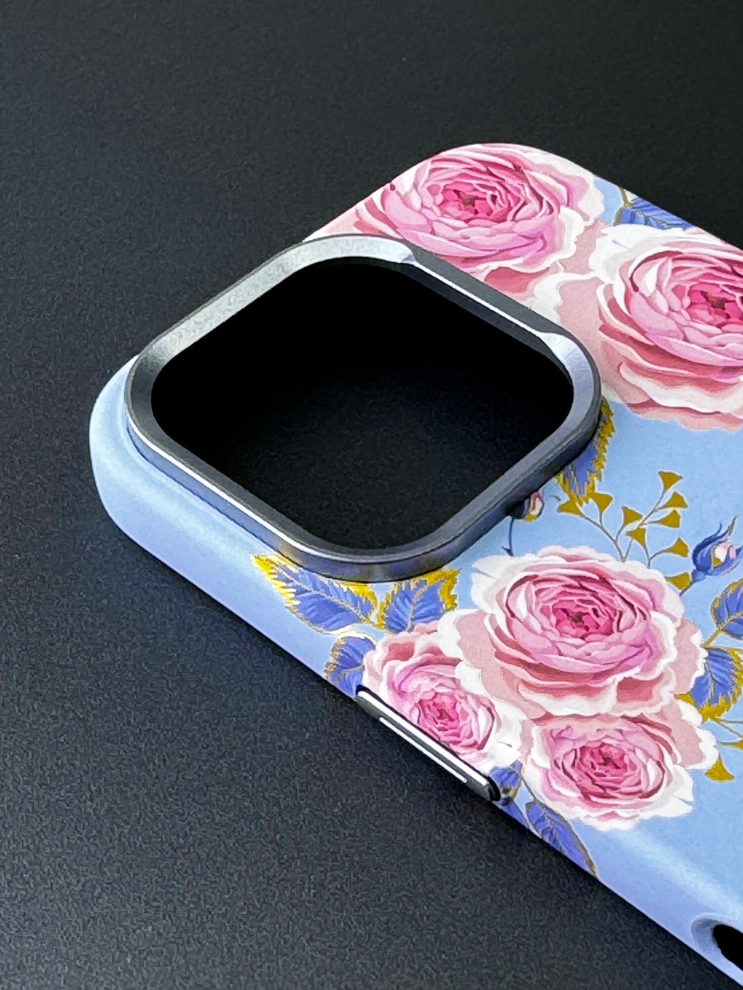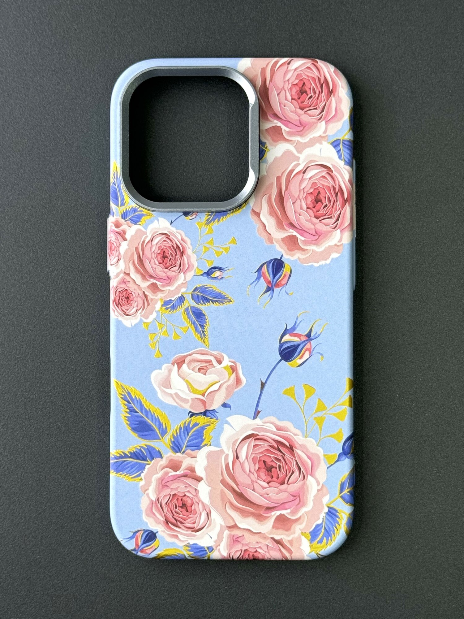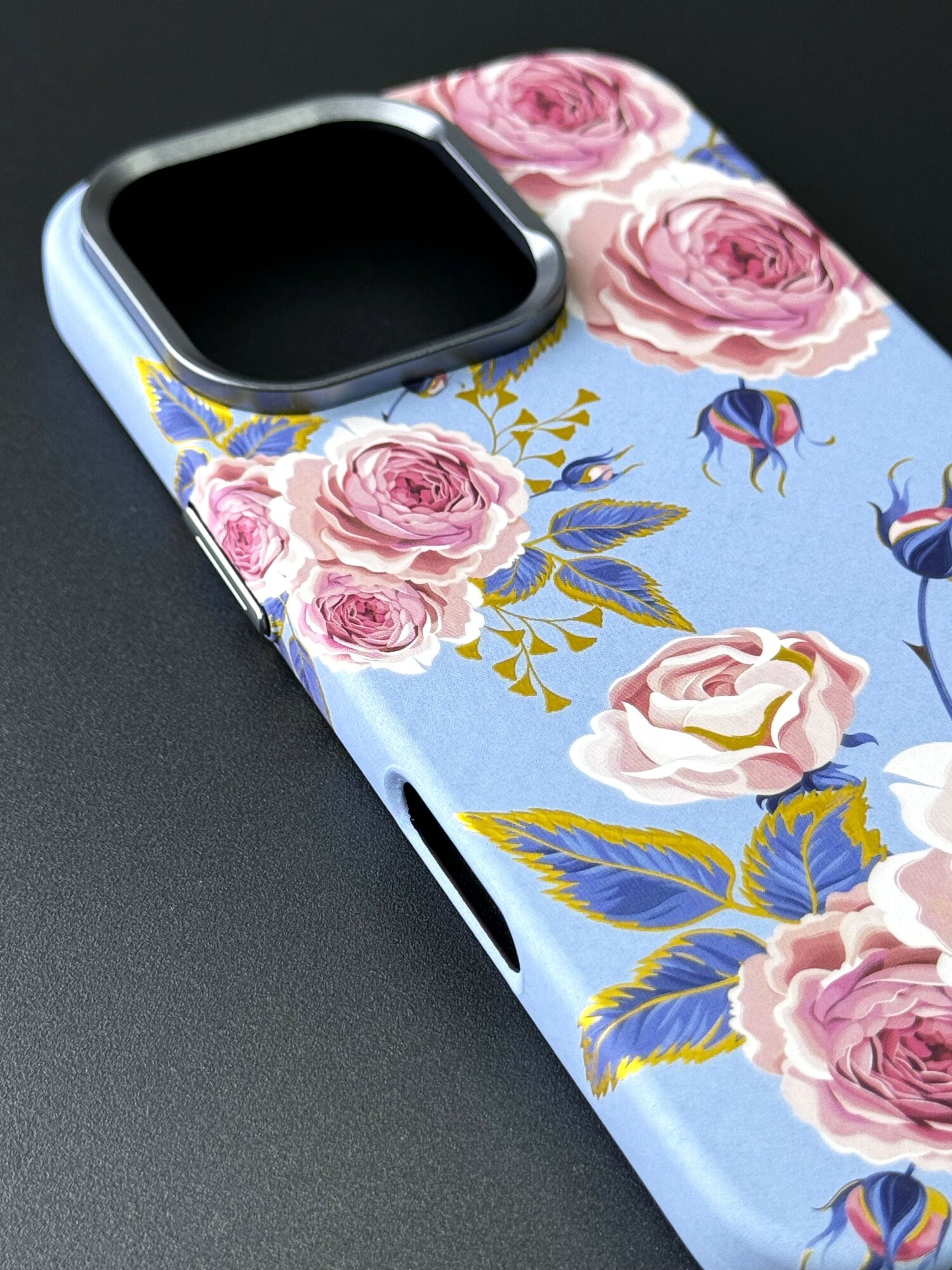 Чехол на IPhone 16 Pro с MAGSAFE из ударопрочного пластика с цветами и защитой камеры голубой интересное: