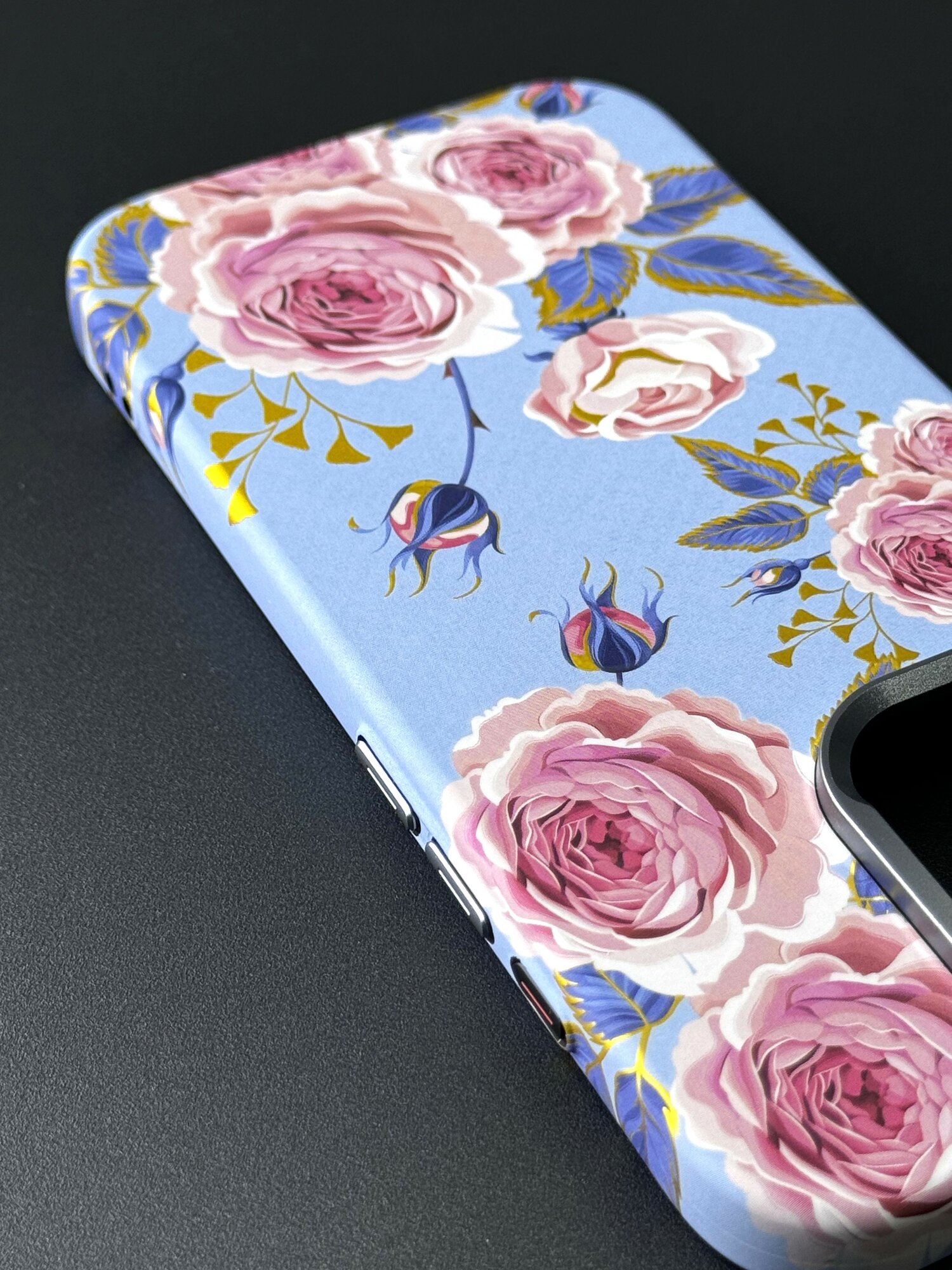 Купить Чехол на IPhone 16 Pro с MAGSAFE из ударопрочного пластика с цветами и защитой камеры голубой