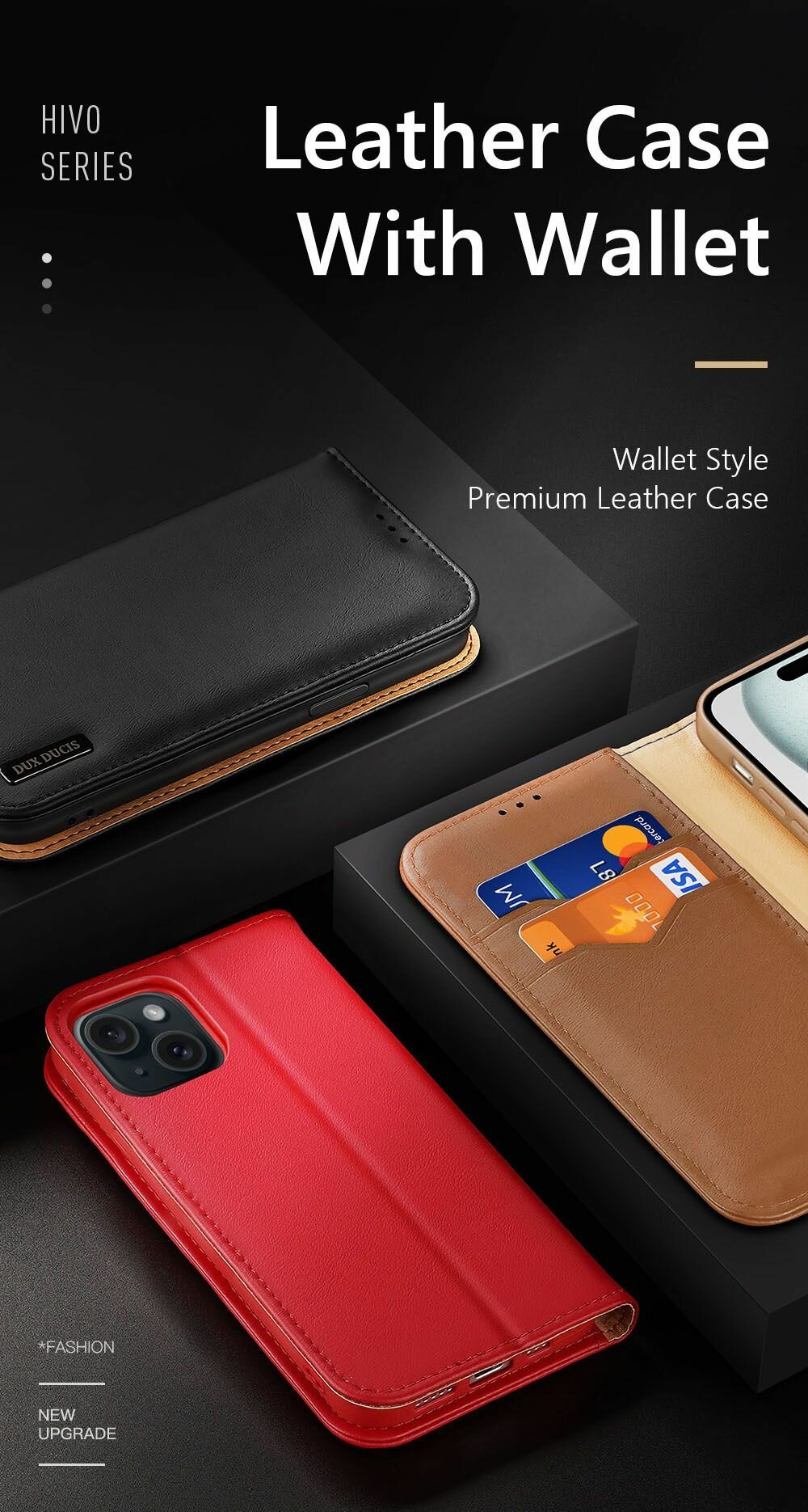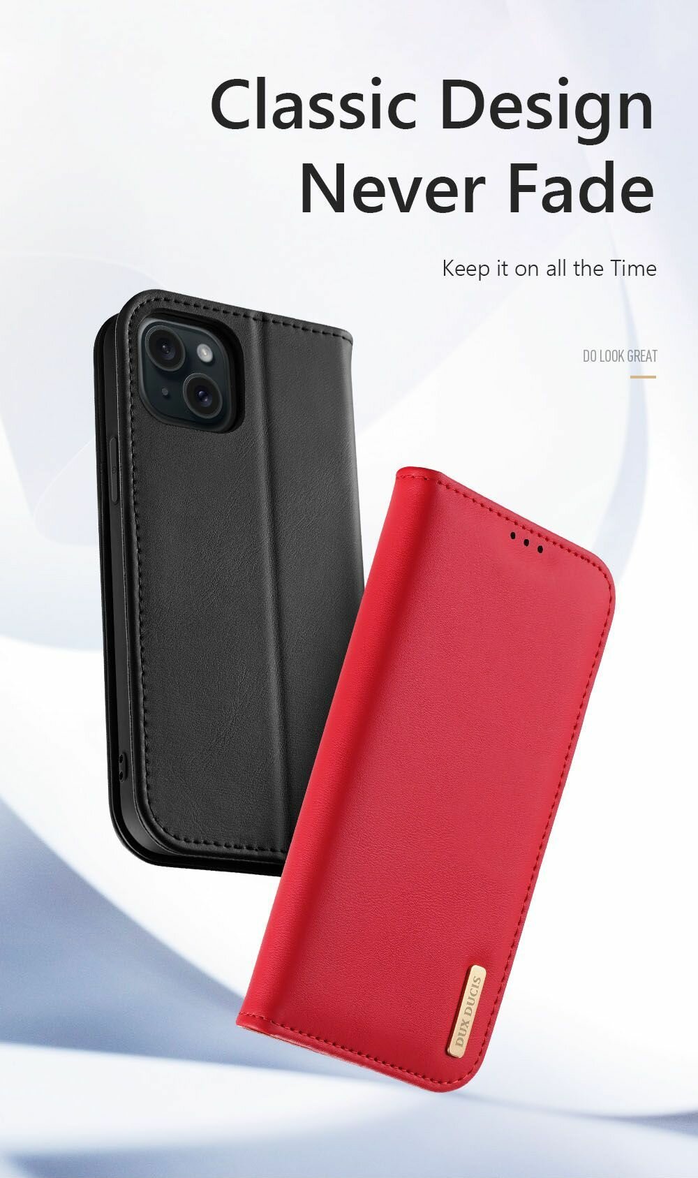 Чехол бумажник из натуральной кожи Dux Ducis для iPhone 15, Hivo series красный интересное: