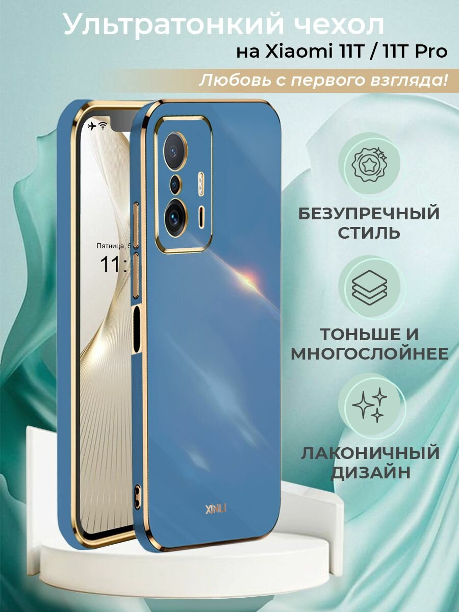 Чехол на Xiaomi 11T / 11T Pro силиконовый стильный защитный бампер для Редми с защитой камеры Сяоми 11Т/ 11Т Про с золотой рамкой Черный