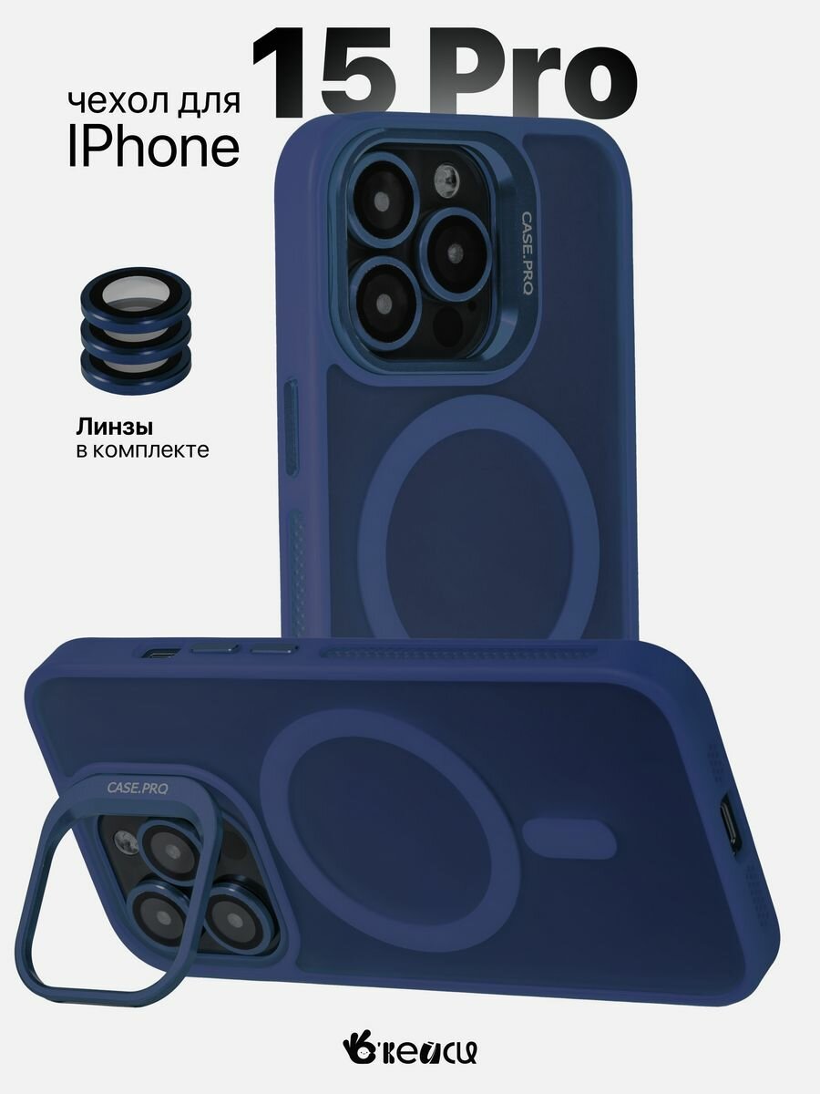 Чехол на iPhone 15 Pro с защитной линзой и держателем, синий интересное: