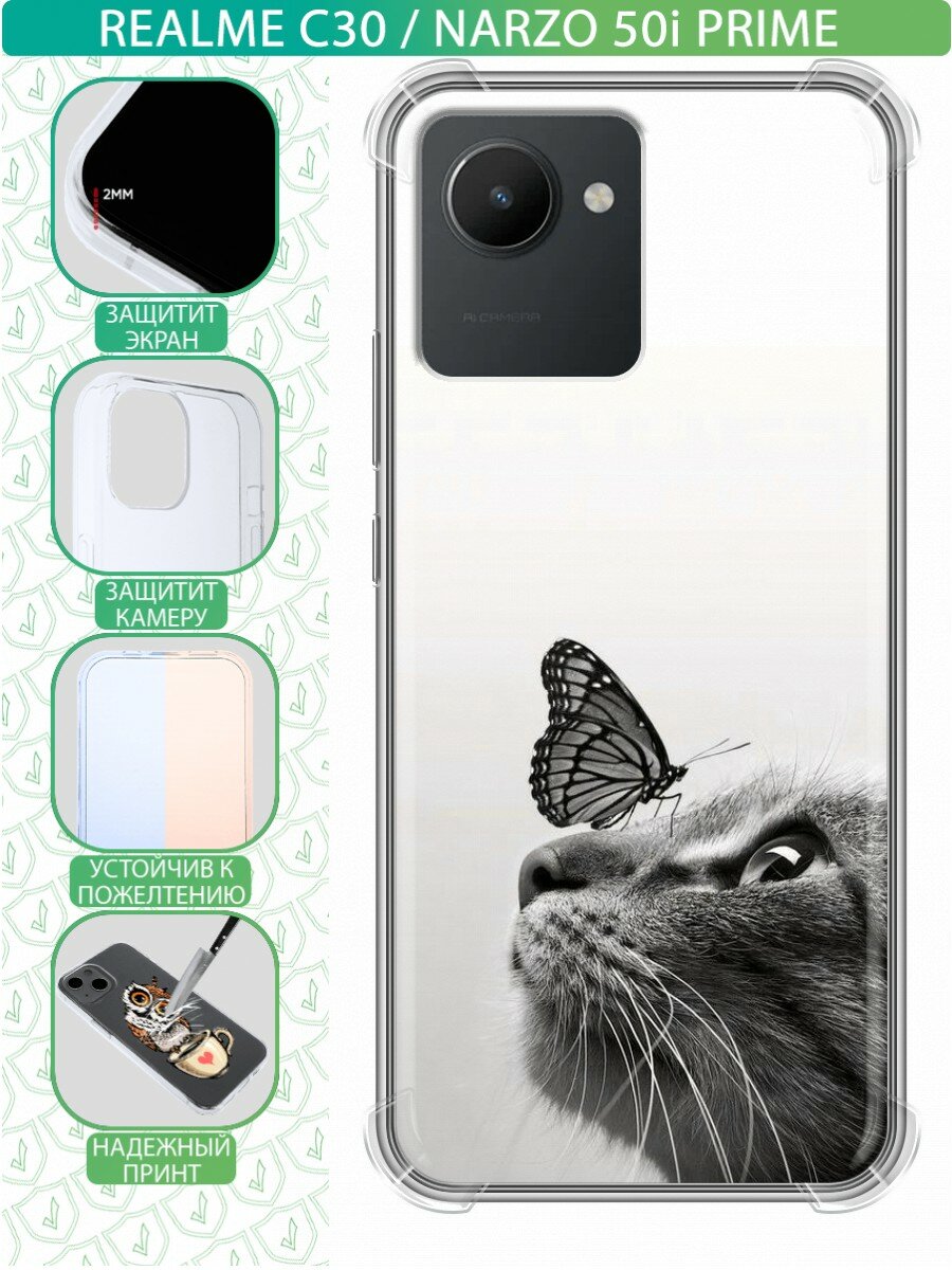 СохранитьДизайнерский силиконовый с усиленными углами чехол для Реалме С30 / Realme C30 Кот и бабочка интересное: