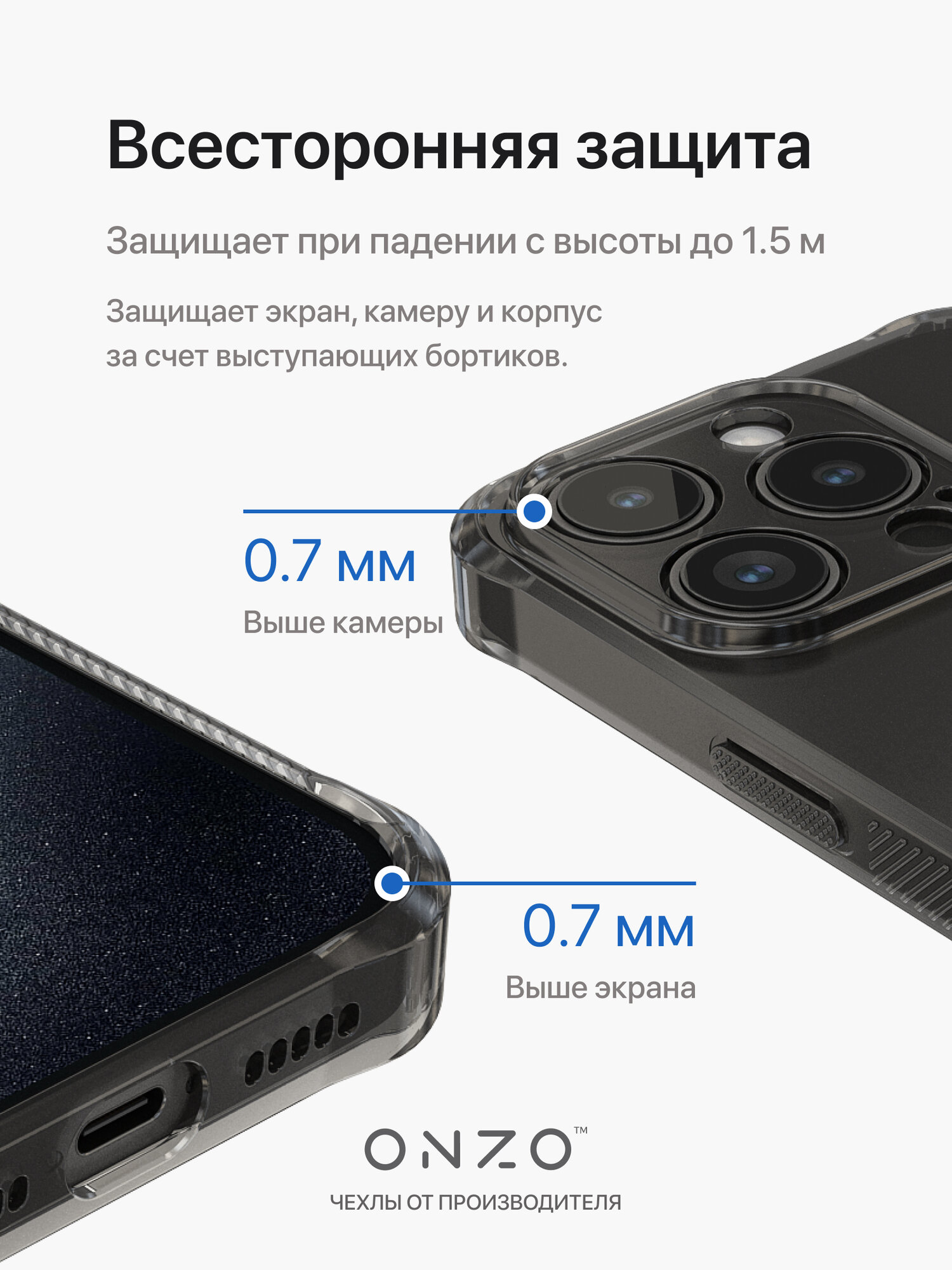 Противоударный бампер для iPhone 15 Pro / Чехол на Айфон 15 Про с рельефными гранями, синий прозрачный