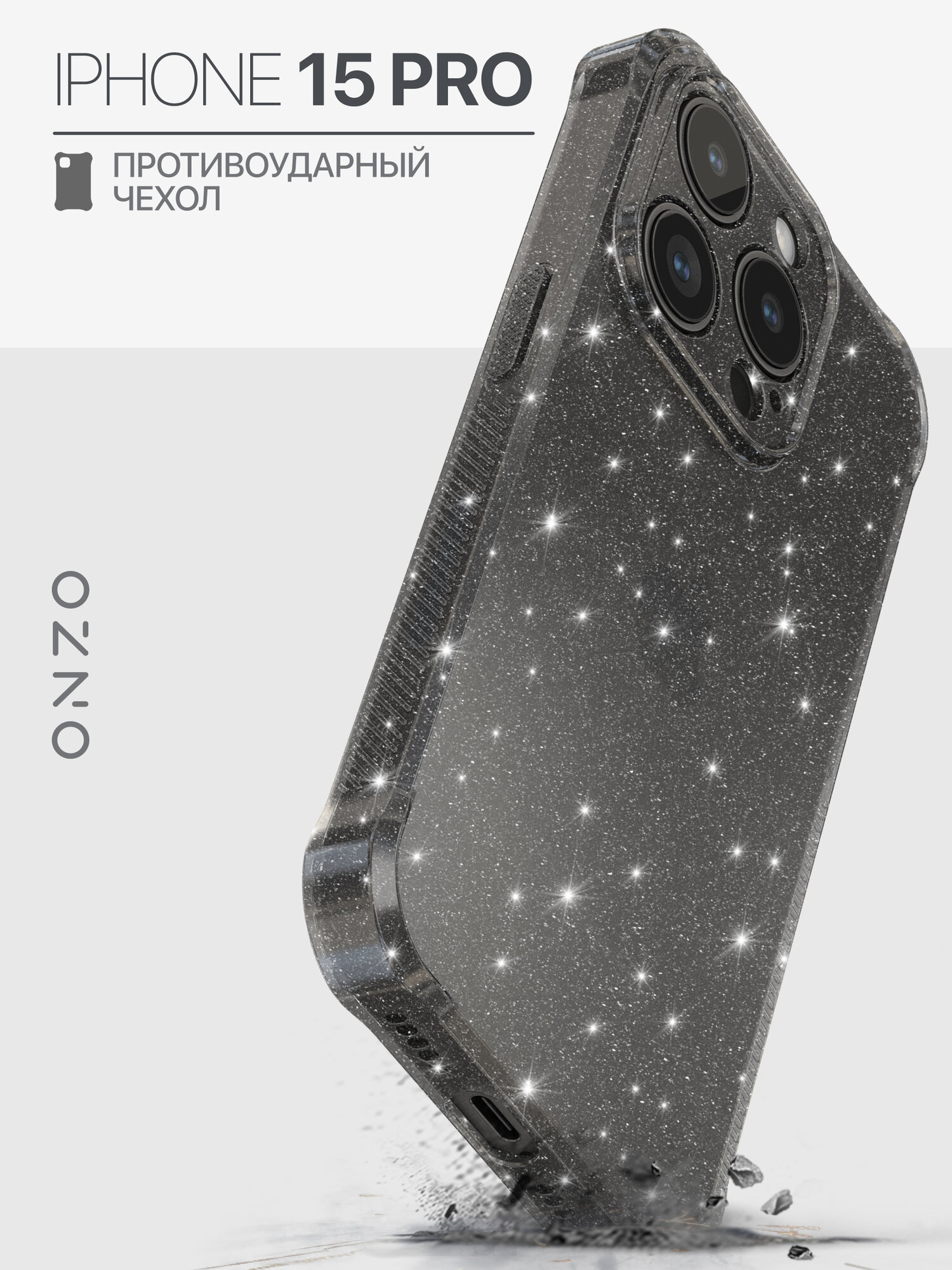 Купить Противоударный чехол на iPhone 15 Pro / Айфон 15 Про бампер черный прозрачный с блестками