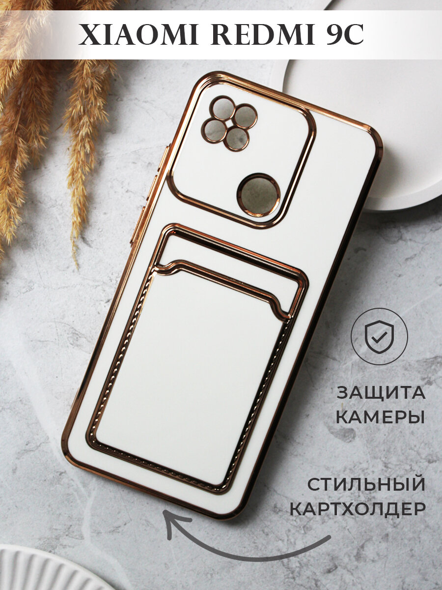 Купить Чехол на Redmi 9C с золотой рамкой противоударный бампер с карманом для карт на редми 9с Белый