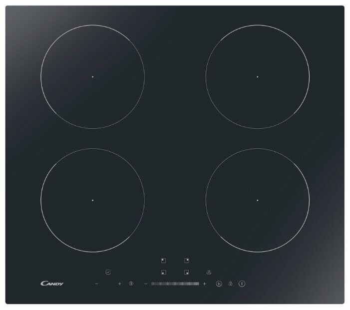 Candy Встраиваемая варочная панель Индукционная шириной 60 см. 4 индукционных зоны нагрева. Управление: сенсорный монослайдер. Режим "Пауза". Режим "Поддержание тепла". Booster. Таймер (мульти). Регулировка максимальной мощности подключения 2,5 - 7,4 кВт.
