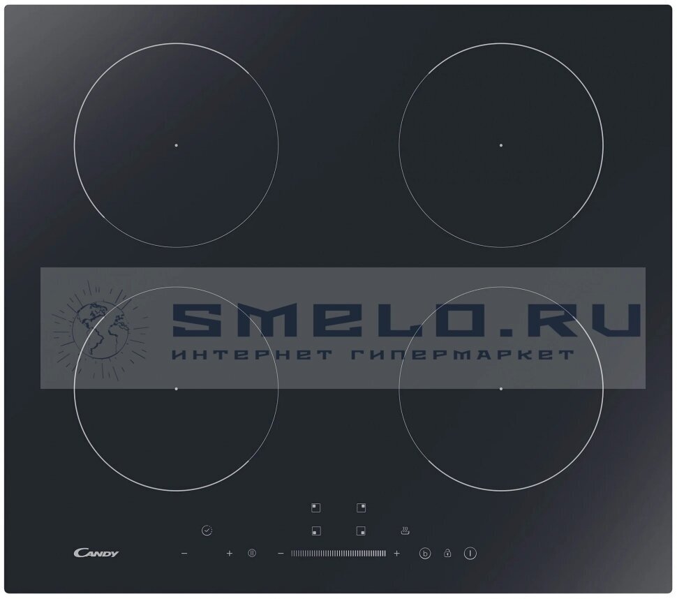 Candy Встраиваемая варочная панель Индукционная шириной 60 см. 4 индукционных зоны нагрева. Управление: сенсорный монослайдер. Режим "Пауза". Режим "Поддержание тепла". Booster. Таймер (мульти). Регулировка максимальной мощности подключения 2,5 - 7,4 кВт.