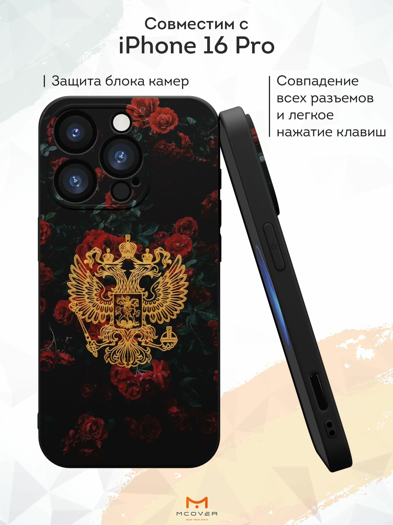 СохранитьСиликоновый чехол Mcover на iPhone 16 Pro, с принтом Герб РФ на фоне роз интересное: