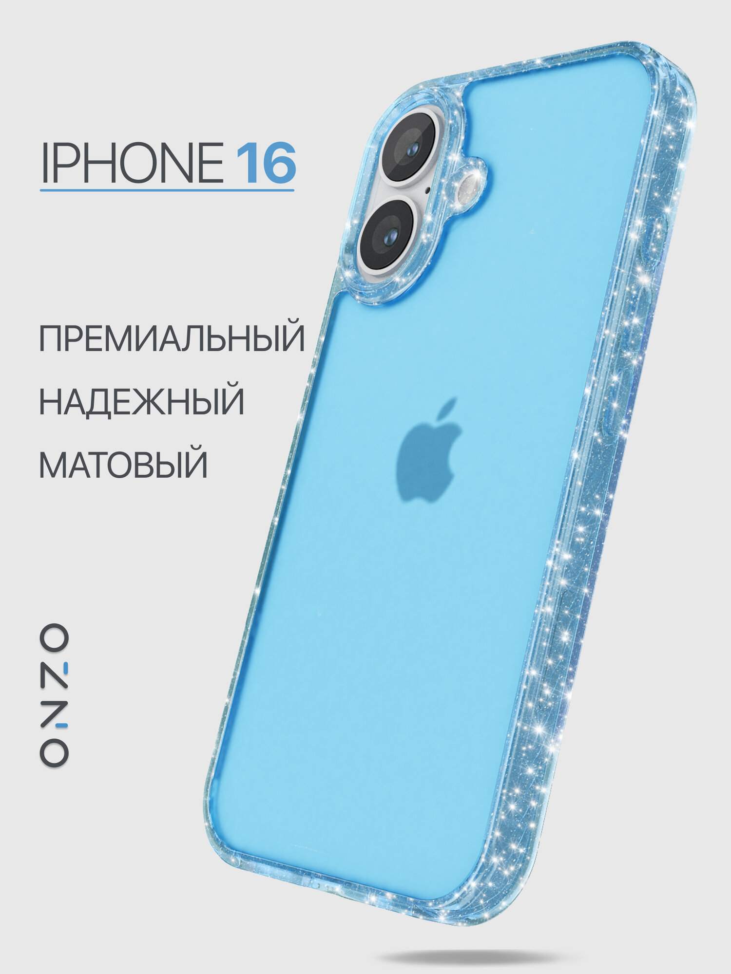 Купить Защитный чехол для iPhone 16 матовый прозрачный голубой / Бампер на Айфон 16 с блестками серебристыми