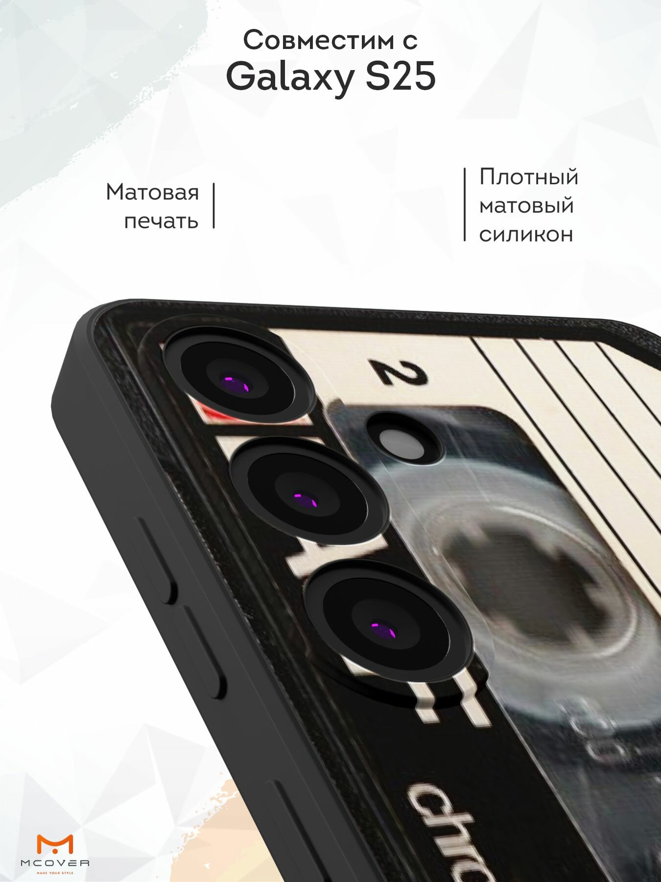 Силиконовый чехол Mcover, на Galaxy S25, с принтом Кассета V.4, черный, с защитой камеры