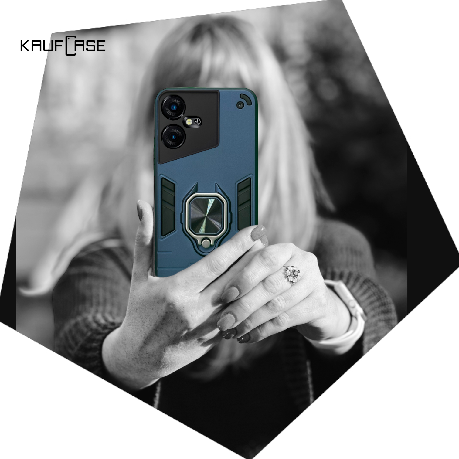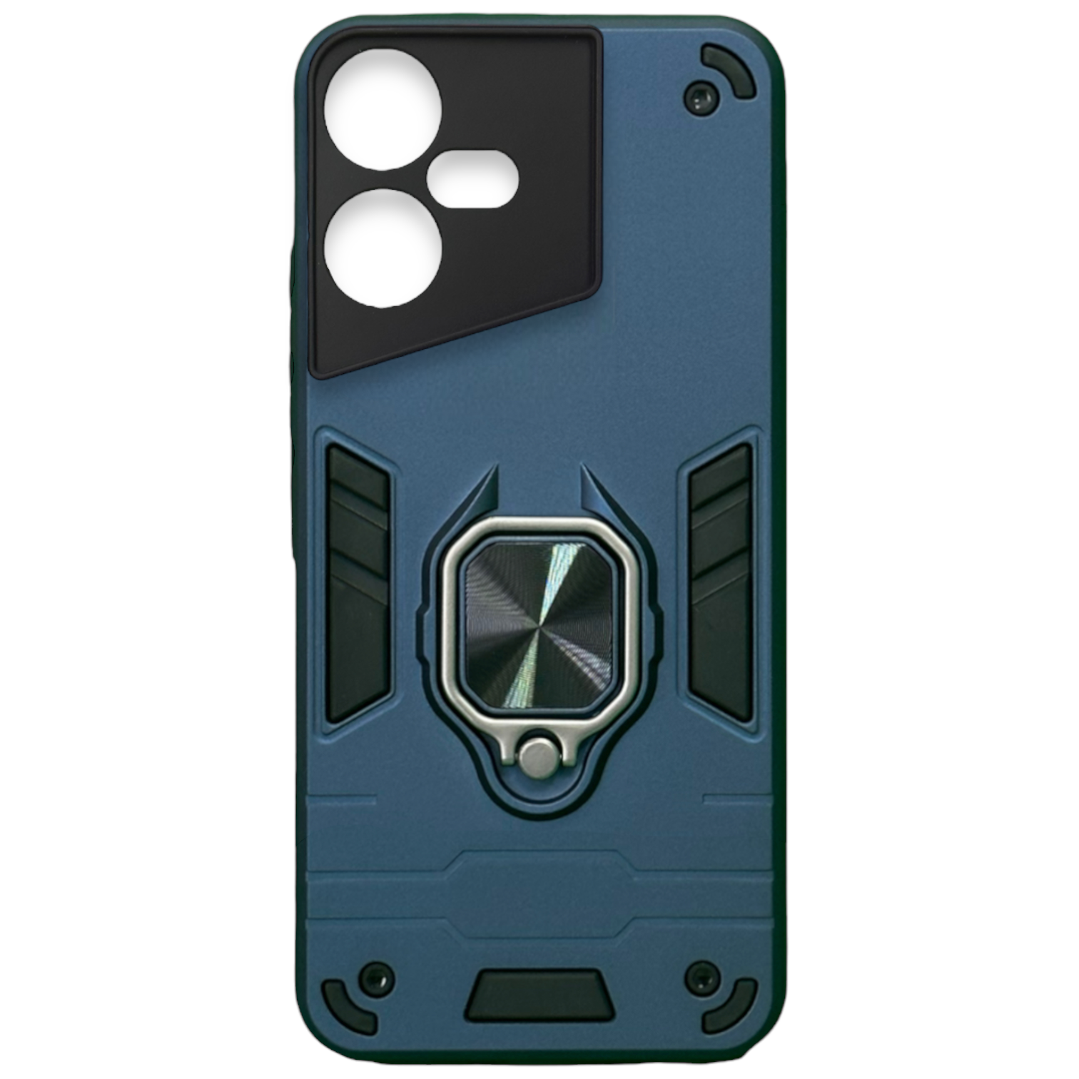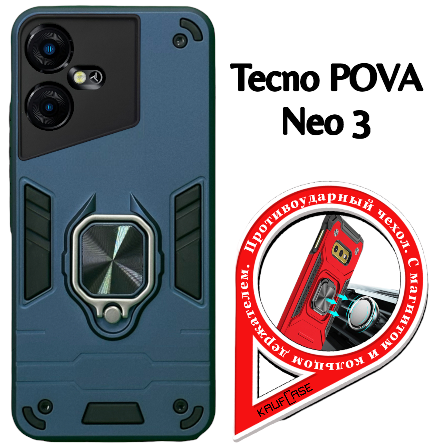 Купить Противоударный чехол на Tecno Pova Neo 3 (LH6n) (6.82"), темно-синий. Кольцо-держатель и магнитное крепление, яркие пластиковые защитные вставки