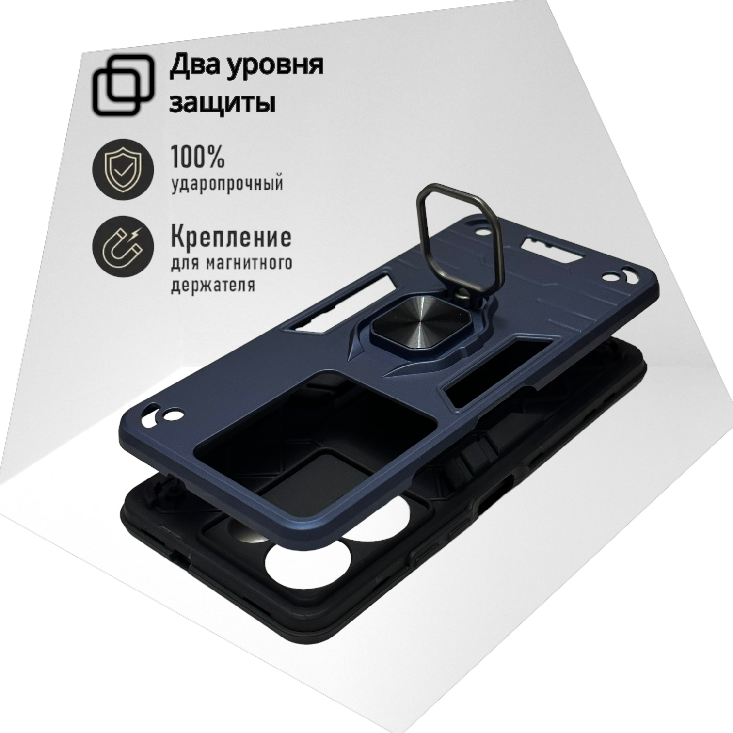СохранитьПротивоударный чехол на Tecno Pova Neo 3 (LH6n) (6.82"), темно-синий. Кольцо-держатель и магнитное крепление, яркие пластиковые защитные вставки интересное: