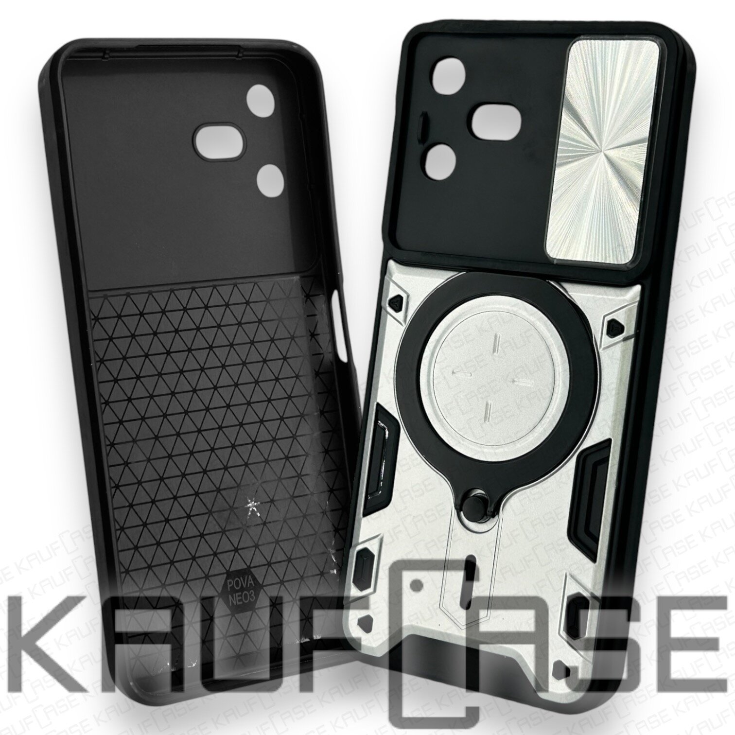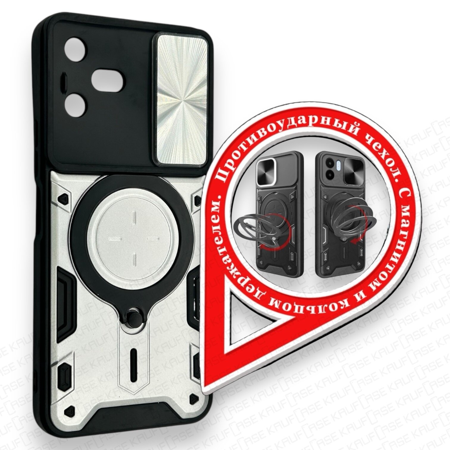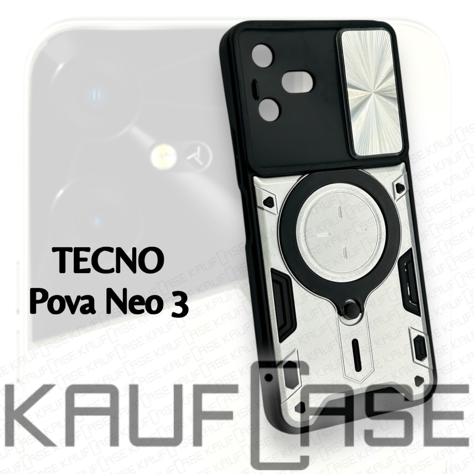 Купить Противоударный чехол на Tecno Pova Neo 3 (LH6n) (6.82"), серебро. Кольцо-держатель и магнитное крепление, яркие пластиковые защитные вставки