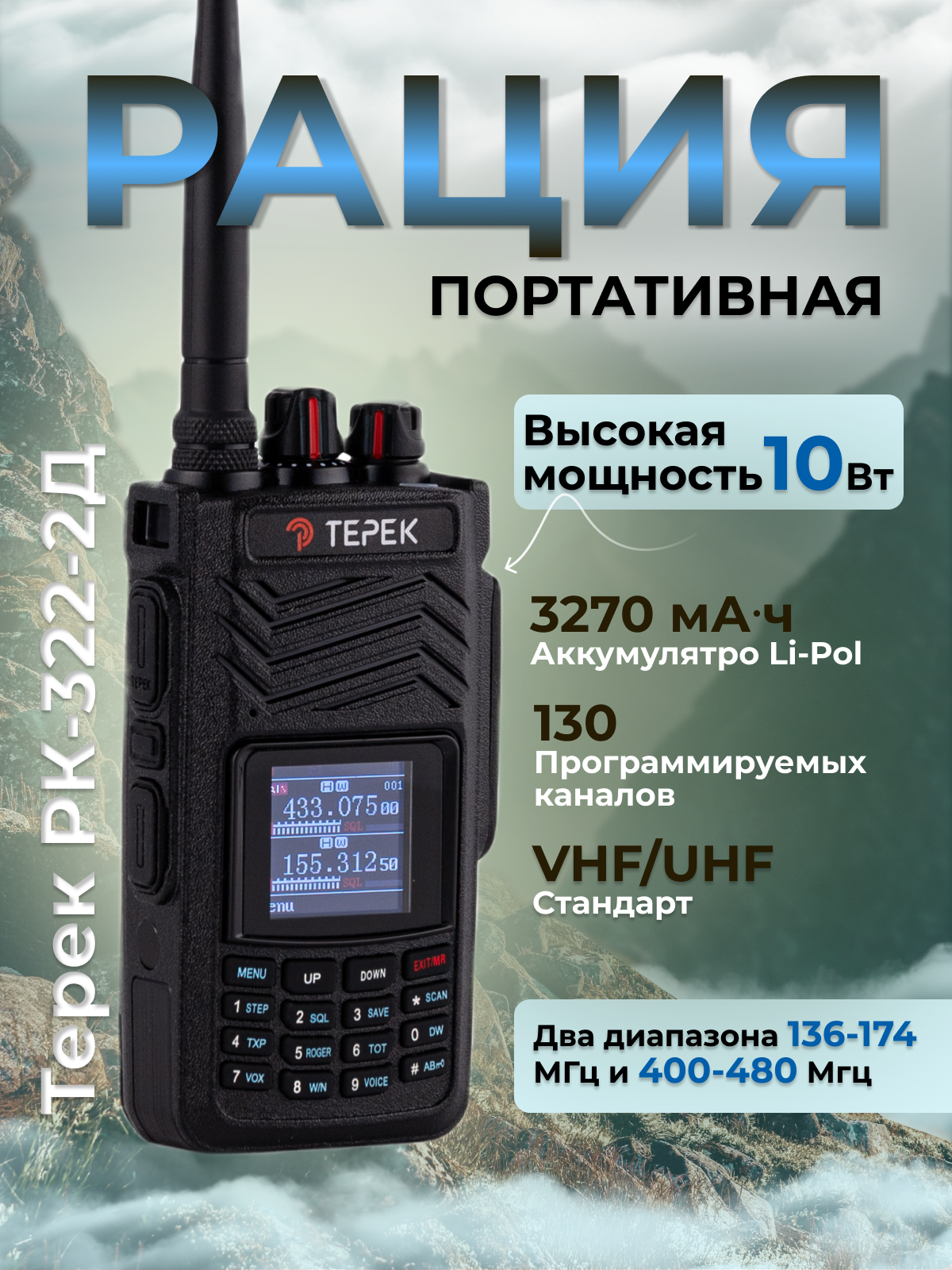 Купить Рация Терек РК-322-2Д, Двухдиапазонная (136-174/400-480 МГц), 10 Вт, 130 каналов
