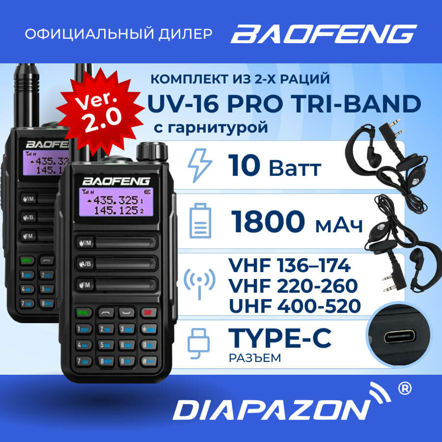 Купить Комплект раций BAOFENG UV-16 PRO 2 шт TRI BAND TYPE-C, 10 Ватт, с гарнитурами, цвет черный