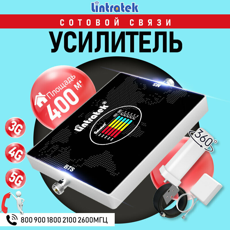 Усилитель сотовой связи Lintratek 5 диапазонов 800-2600 МГц с AGC антенна 4G 15м кабель 400 м² покрытие