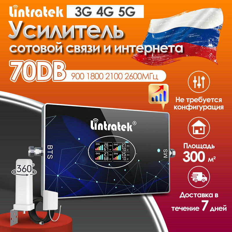 Усилитель сотовой связи Lintratek 5 диапазонов 800-2600 МГц с AGC антенна 4G 15м кабель 400 м² покрытие