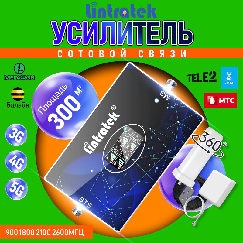Усилитель сотовой связи Lintratek 5 диапазонов 800-2600 МГц с AGC антенна 4G 15м кабель 400 м² покрытие