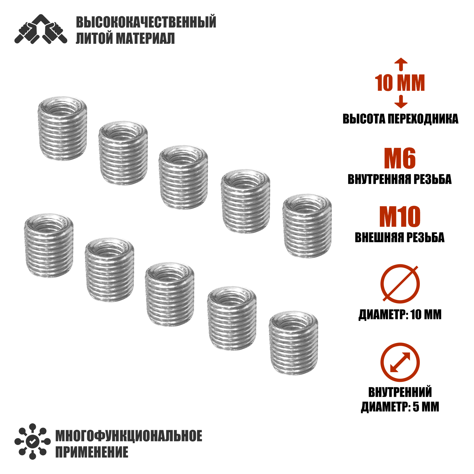 Купить Резьбовая гайка переходник с внешней резьбой М10 и внутренней резьбой М6, высота 10 мм, 10 шт