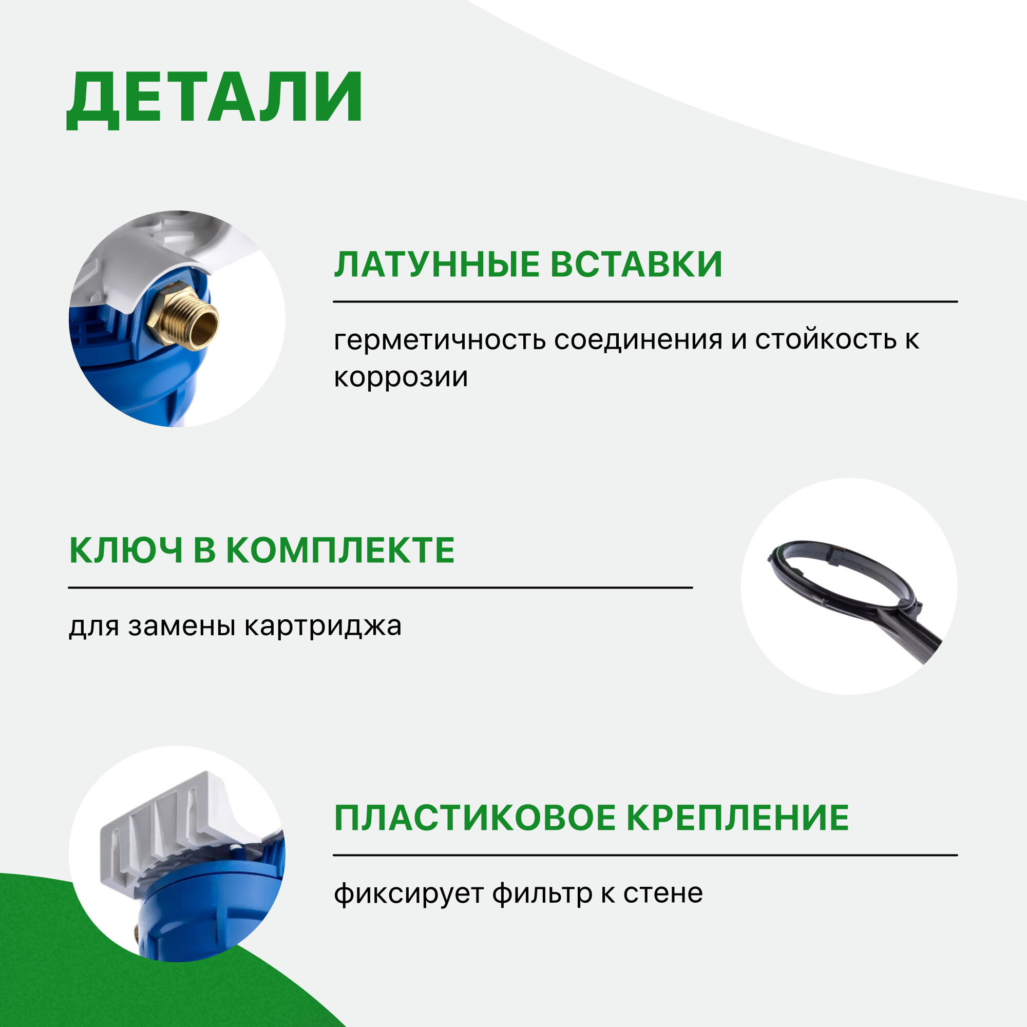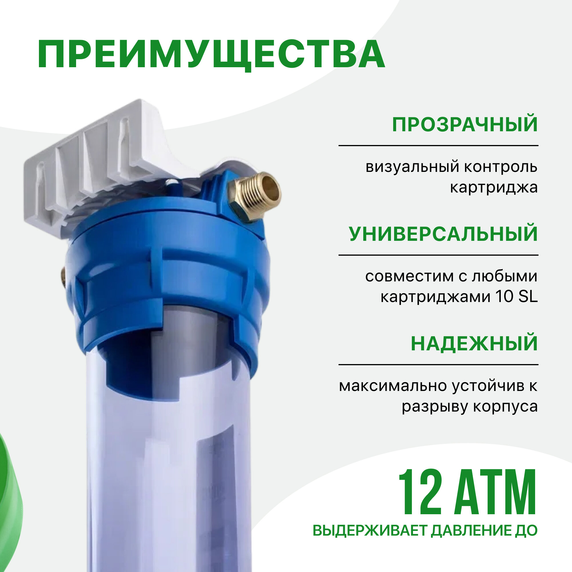 | Дополнительная информация | макс. температура воды на входе: 40 °C; макс. давление на входе: 7 атм; применяется совместно с картриджем 10 SL; присоединительный размер: 3/4"; в комплекте ключ для замены картриджей |