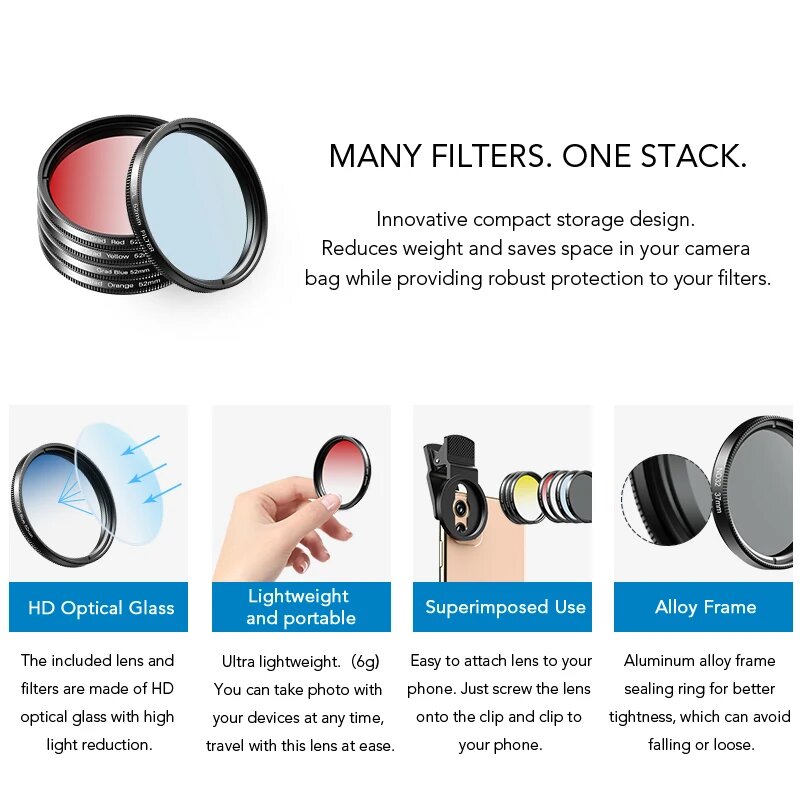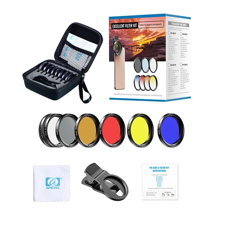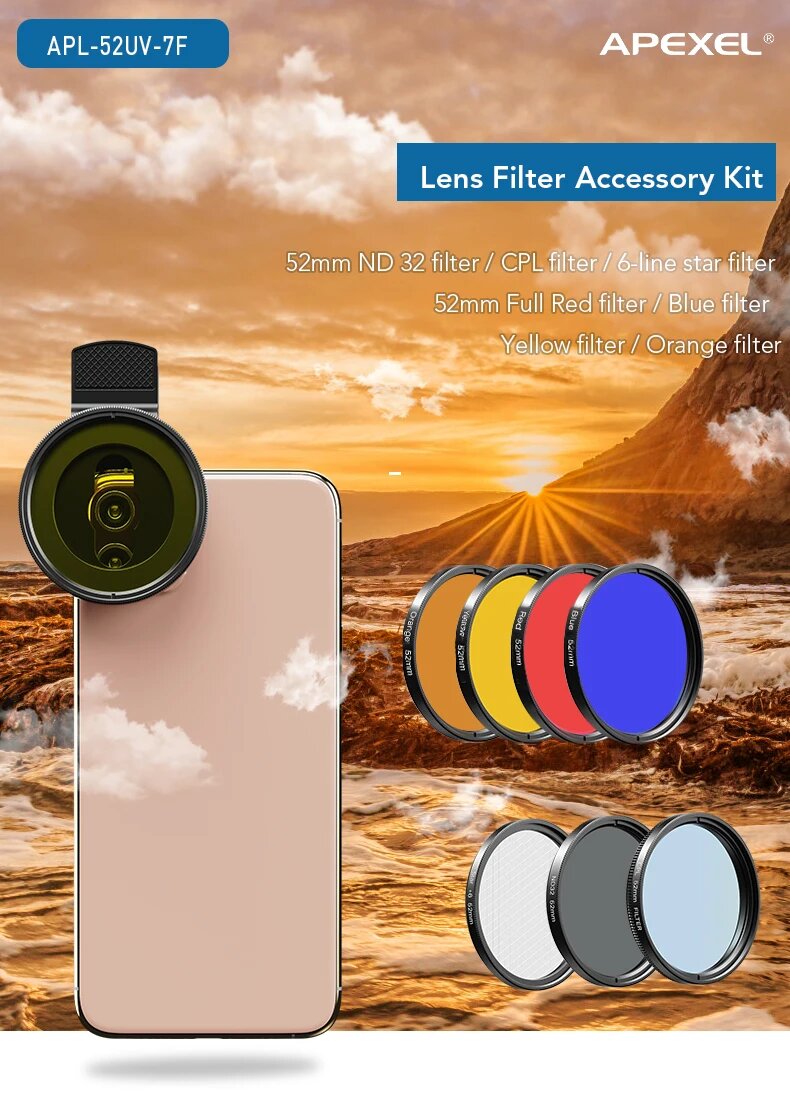 Купить APEXEL 7 в 1 набор фильтров для камеры 37/52мм, 7 in 1 kit, 52 мм