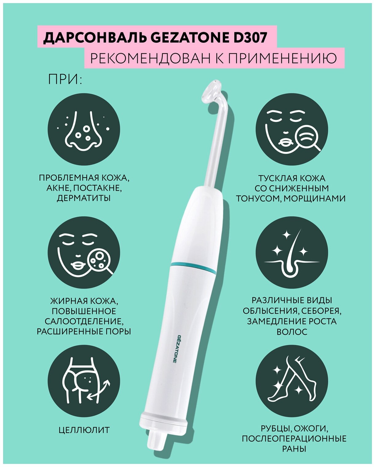 Дарсонваль Gezatone BP-7000, 5 насадок, для лица, тела и волос, бирюзовый