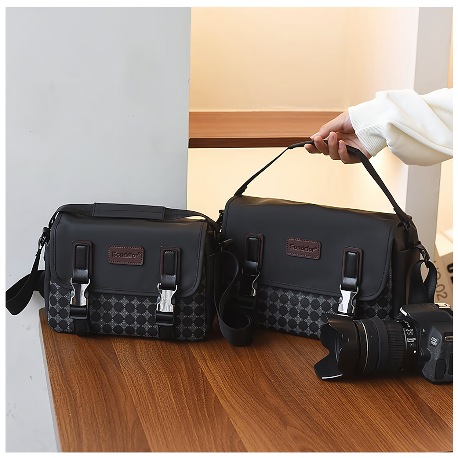 Купить Сумка для фотокамеры, водонепроницаемая ткань, 3 отделения, плечевой ремень, черная в клетку, 30х15х20 см