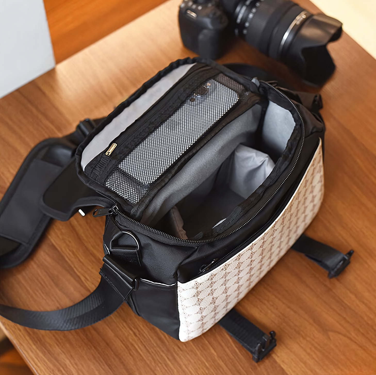 Купить Сумка для фотокамеры, водонепроницаемая ткань, 3 отделения, плечевой ремень, черная в бежевую клетку, 24х13х17 см