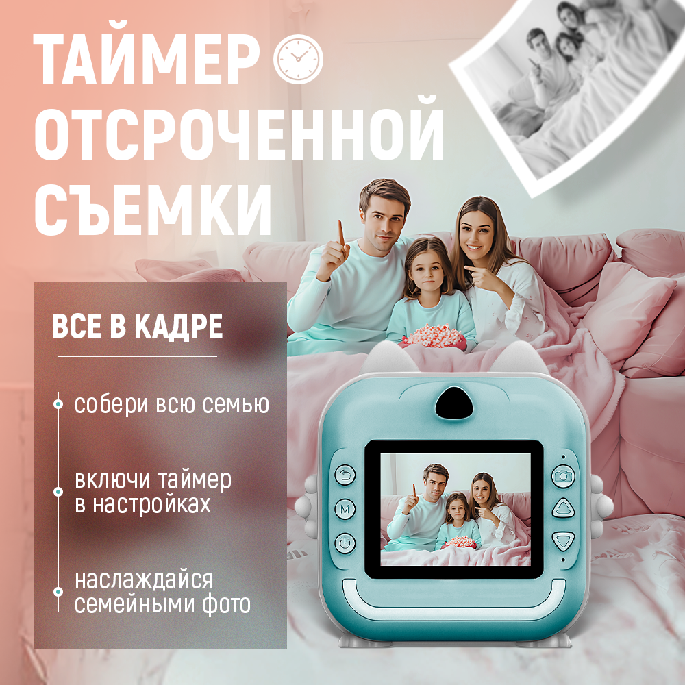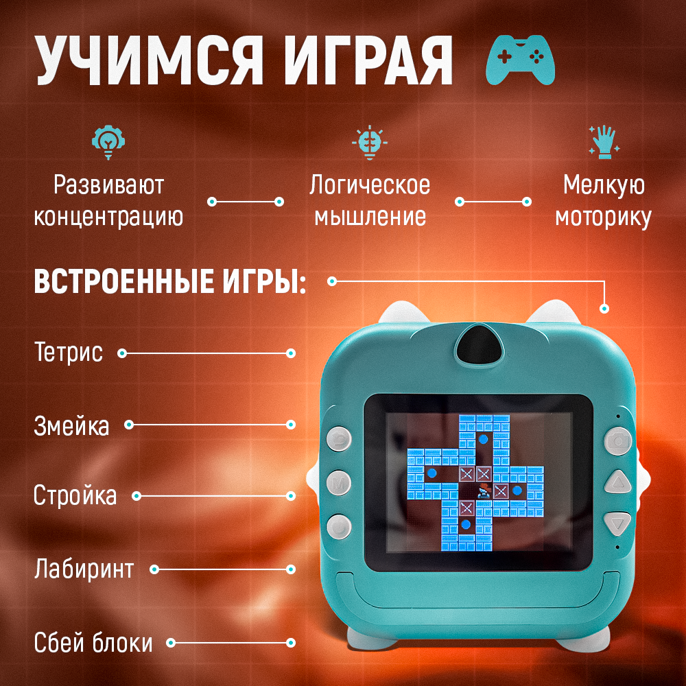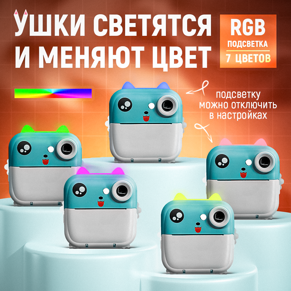 Детский фотоаппарат моментальной печати, встроенные игры, MP3 плеер, печать фото с телефона, бирюзовый котик интересное: