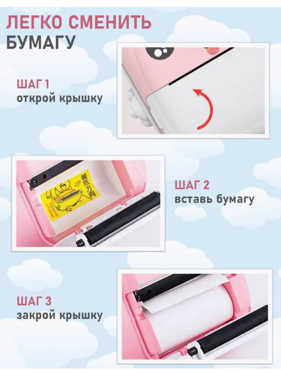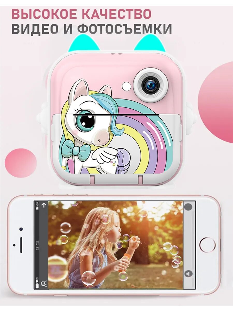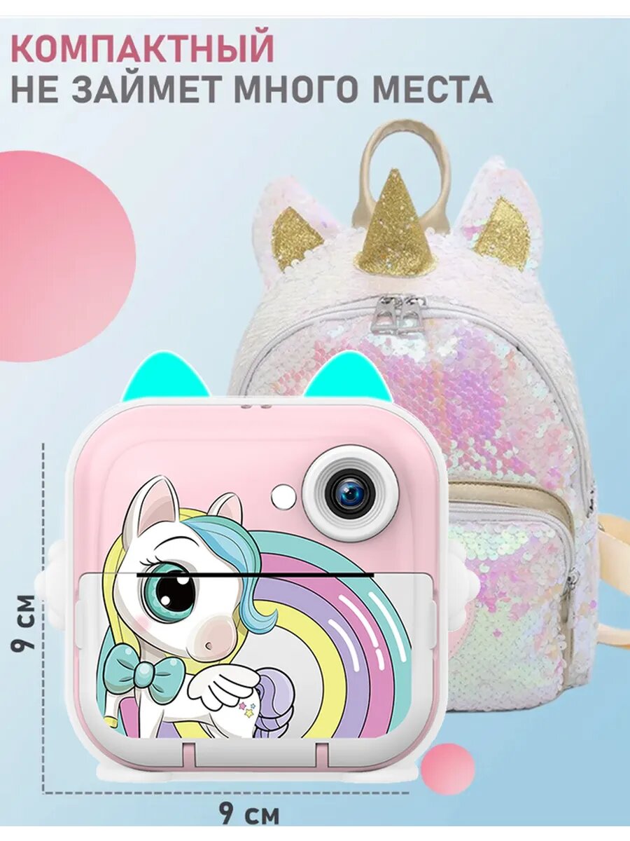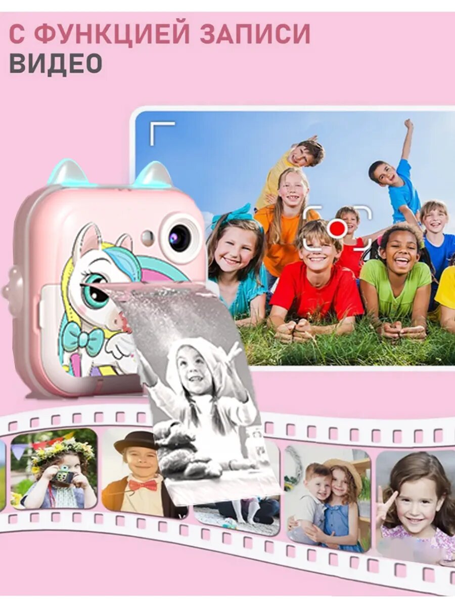 Детский фотоаппарат мгновенной печати, с чехлом, 3 рул. бумаги, наклейки, фломастеры, USB-кабель