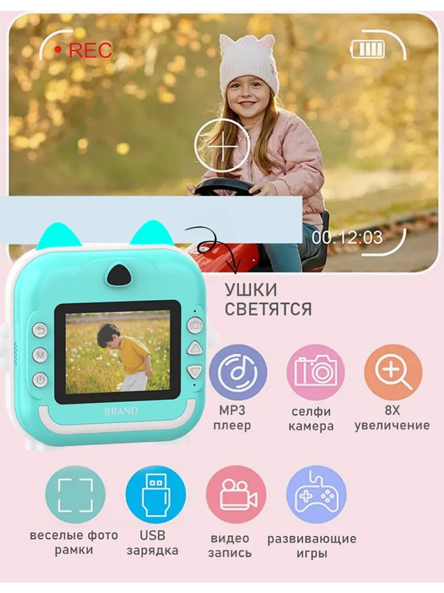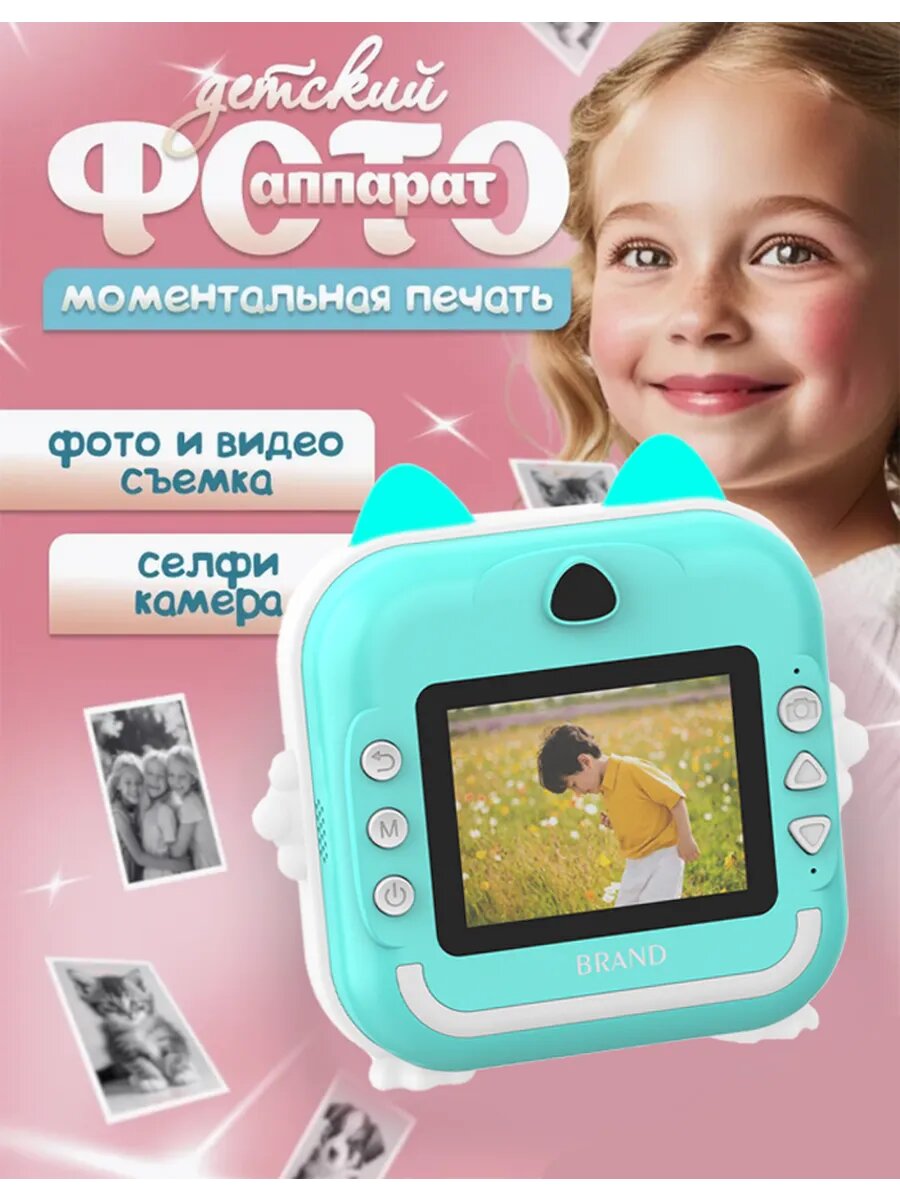 Детский фотоаппарат мгновенной печати, с чехлом, 3 рул. бумаги, наклейки, фломастеры, USB-кабель интересное: