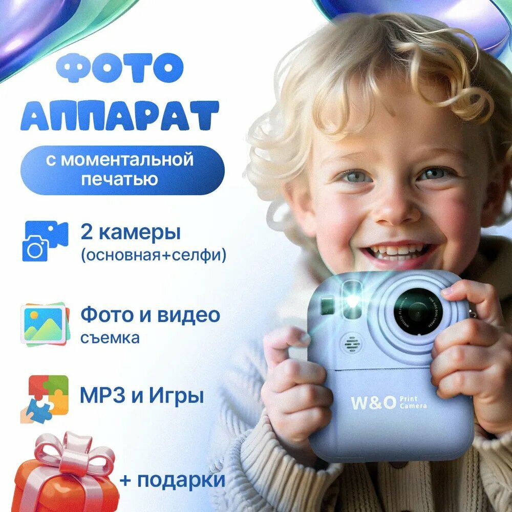 Фотоаппарат моментальной печати, детский, Kids toys, с картой памяти 32ГБ, голубой интересное: