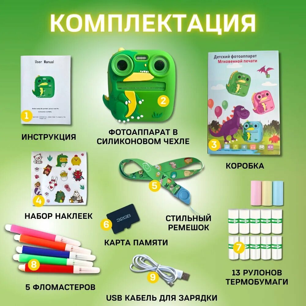 Фотоаппарат моментальной печати детский "Дино",Детская печатная камера, Kids toys,зеленый интересное: