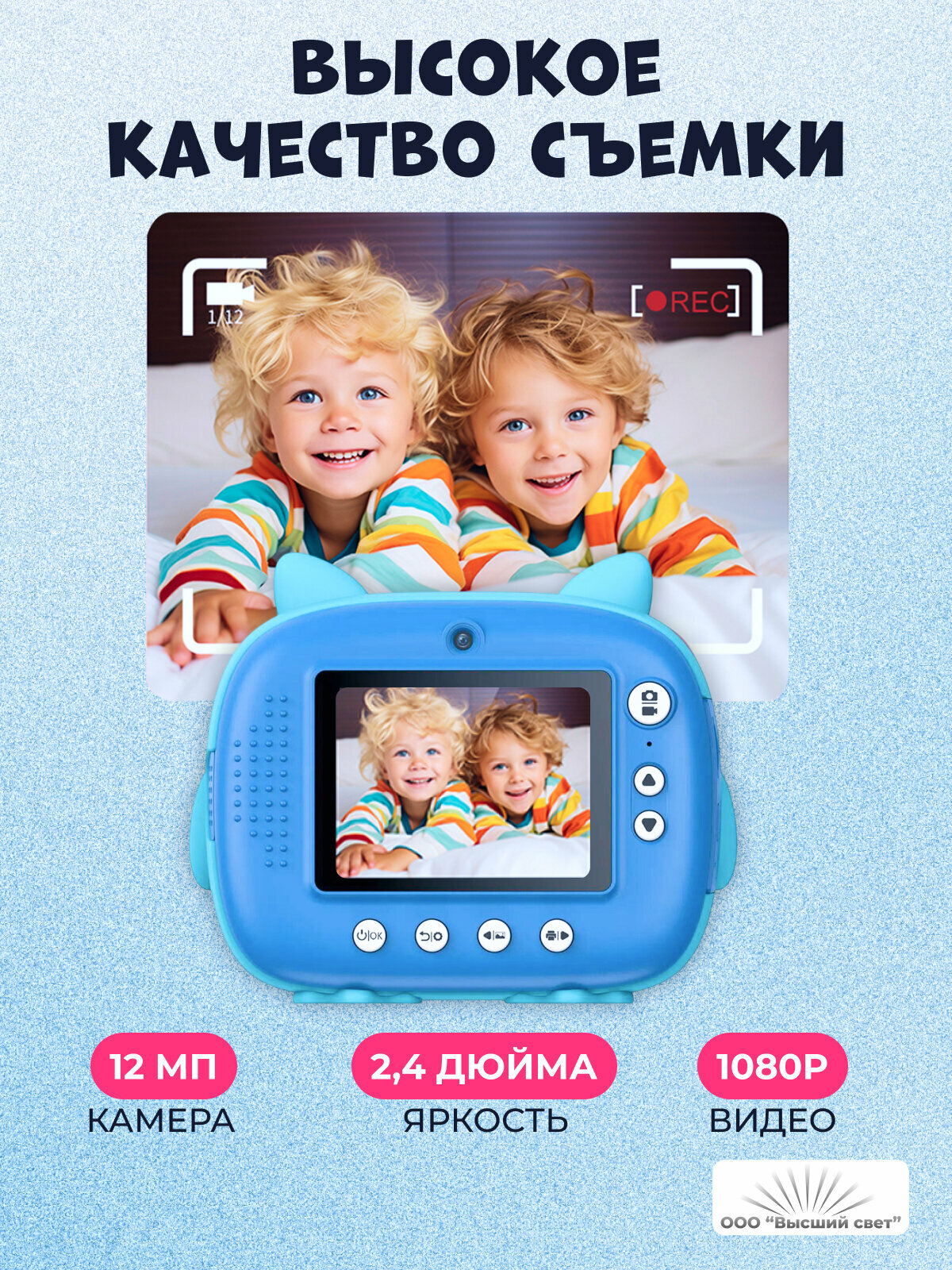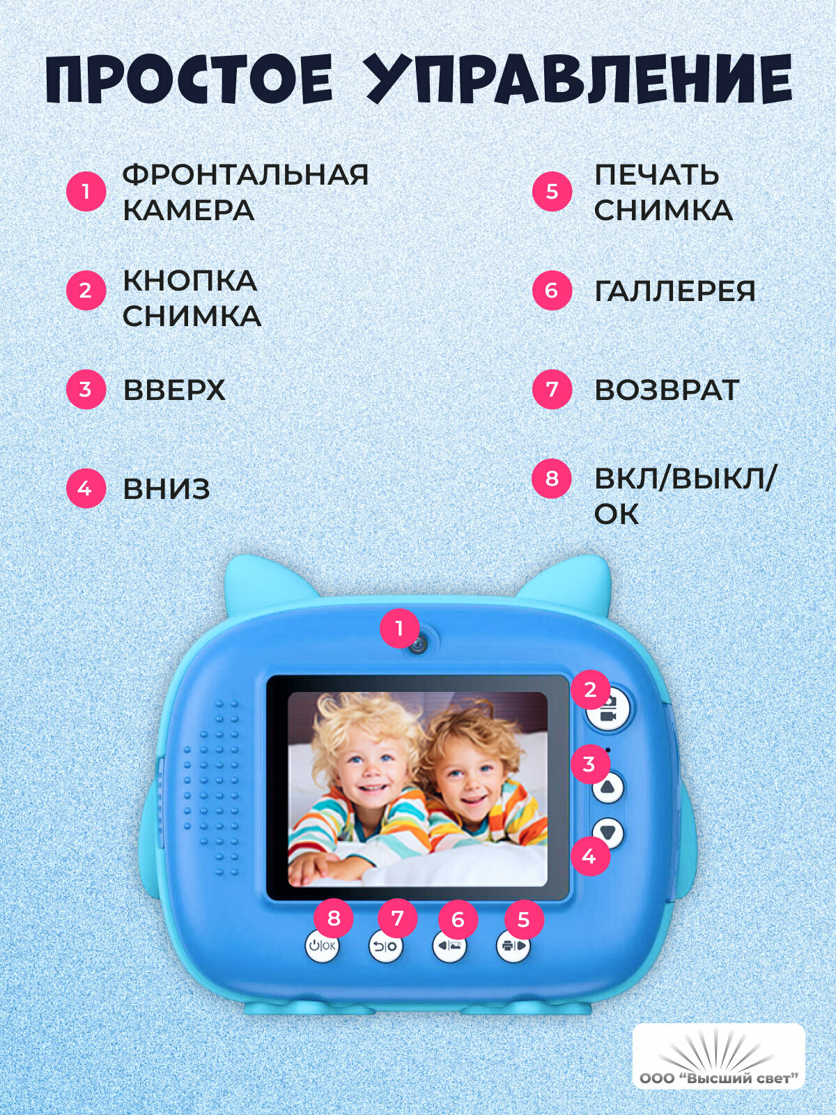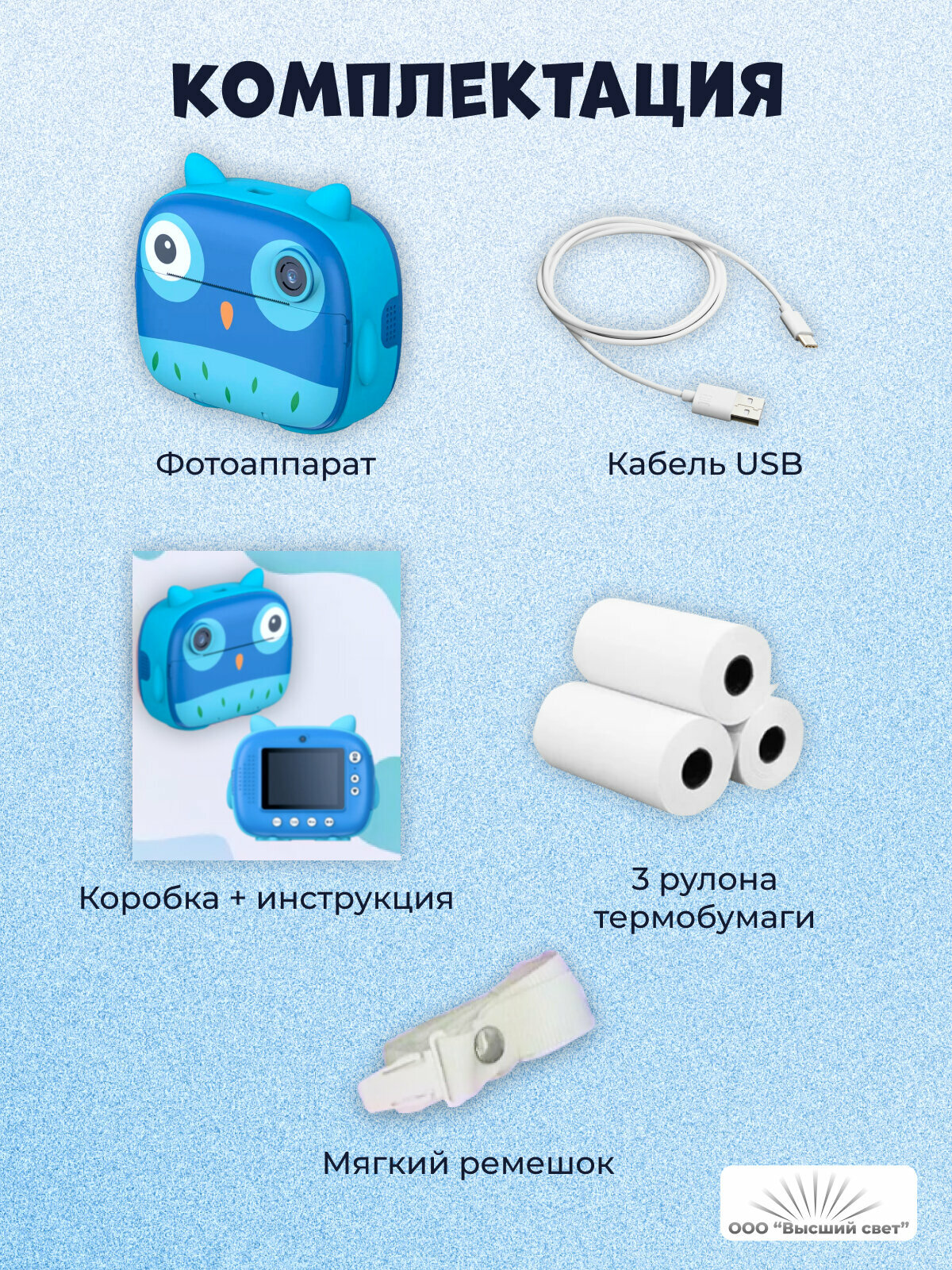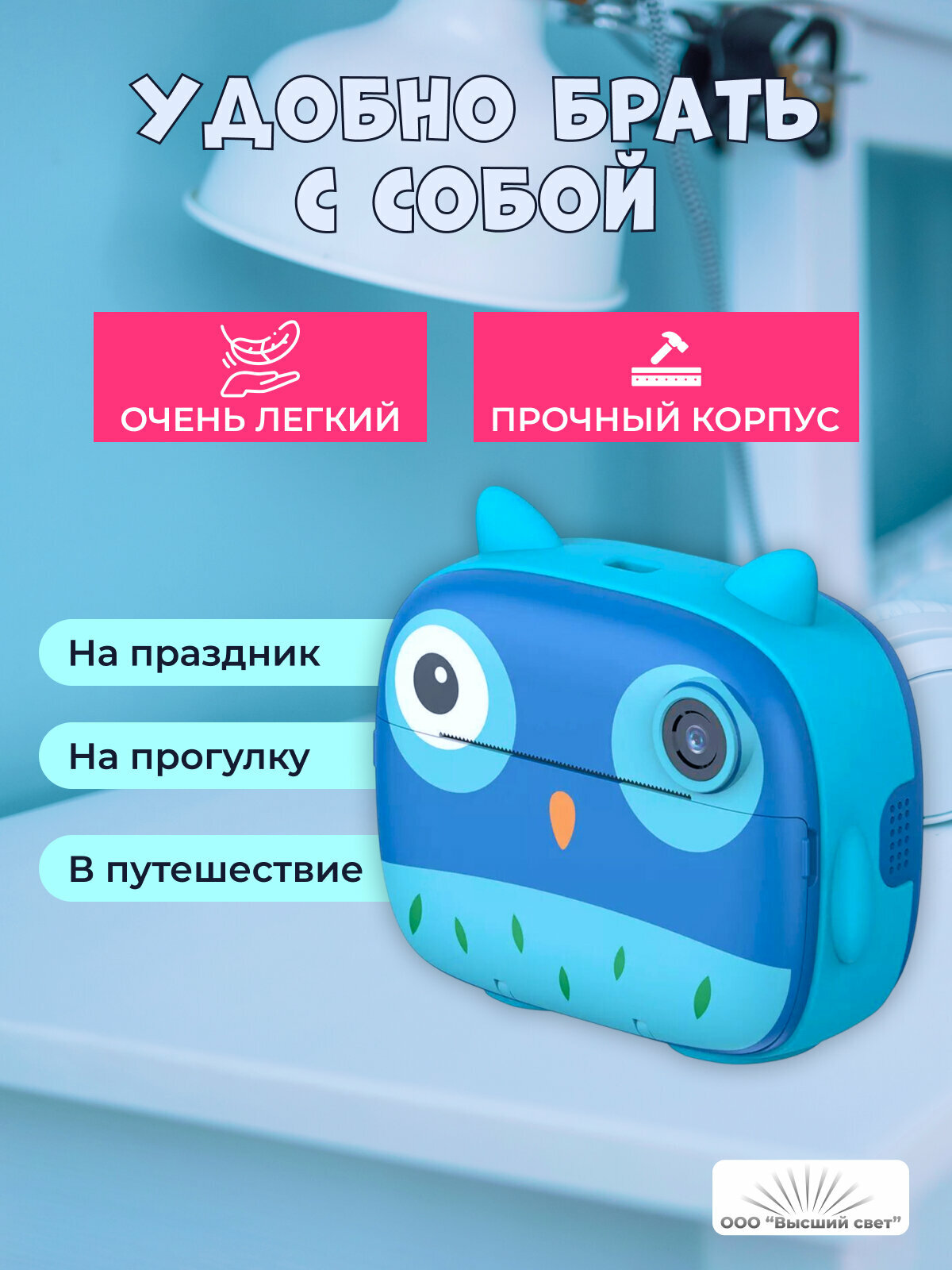 Детский фотоаппарат с моментальной печатью Полароид Селфи и игры, сова, голубой интересное: