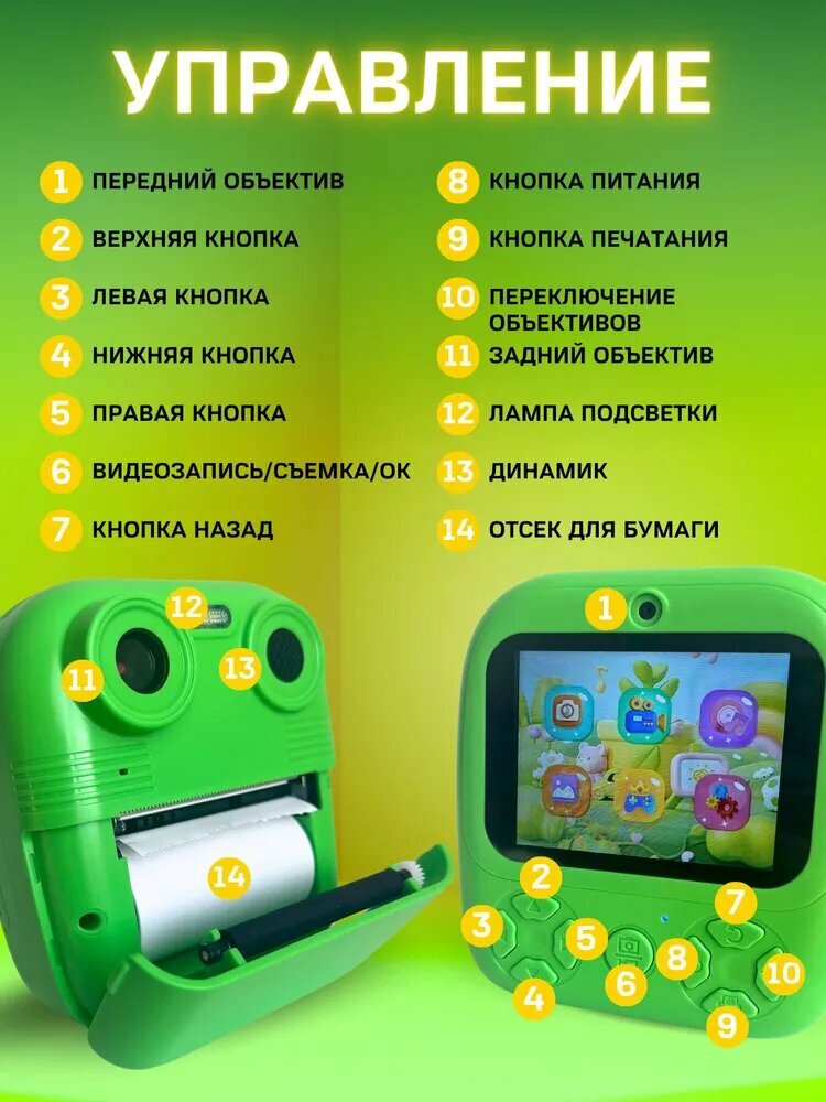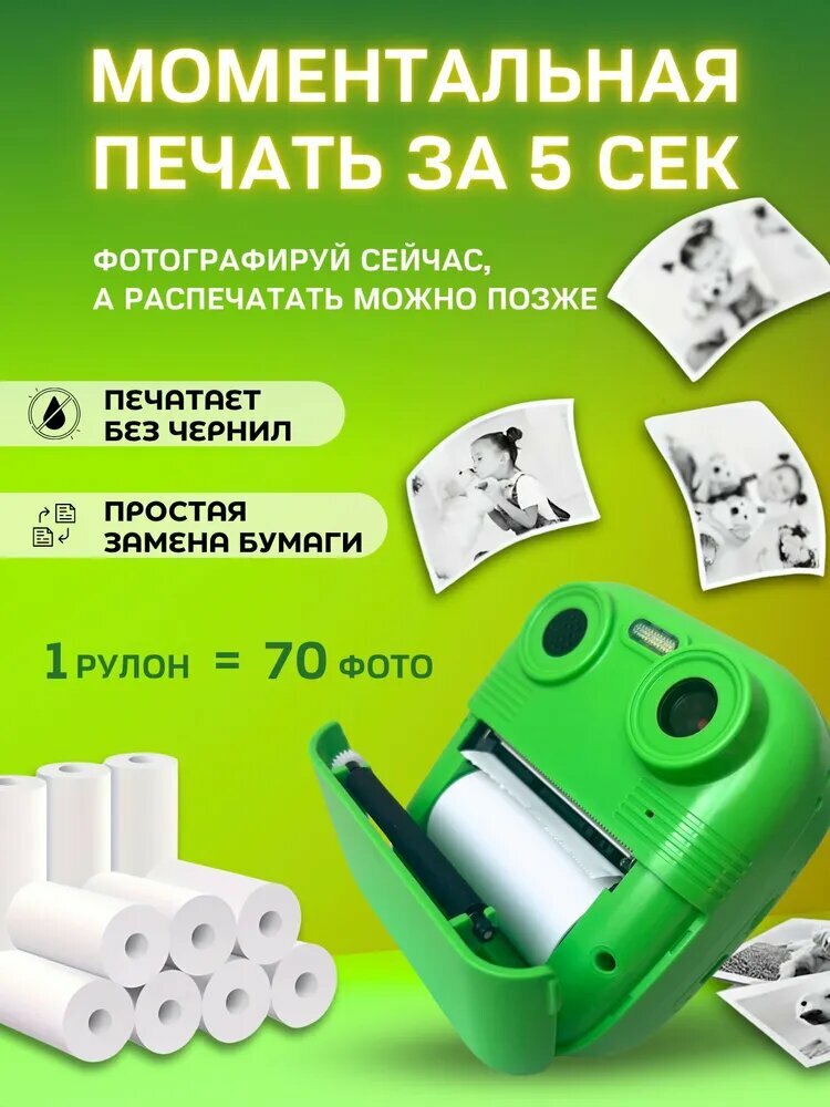 Детский фотоаппарат "Дино", моментальная печать, вращающаяся камера, 180°, 32ГБ, зелёный/жёлтый интересное:
