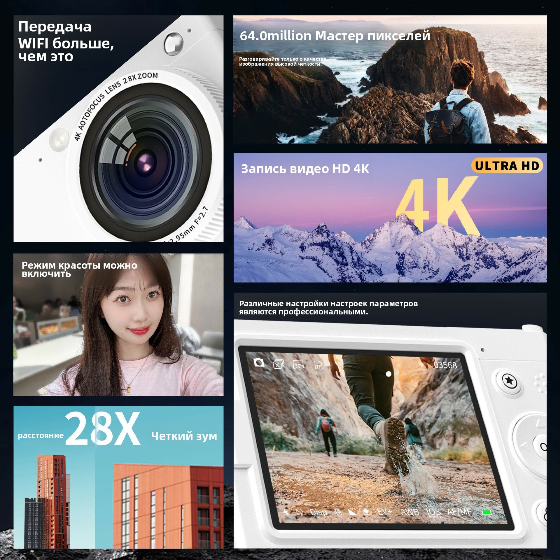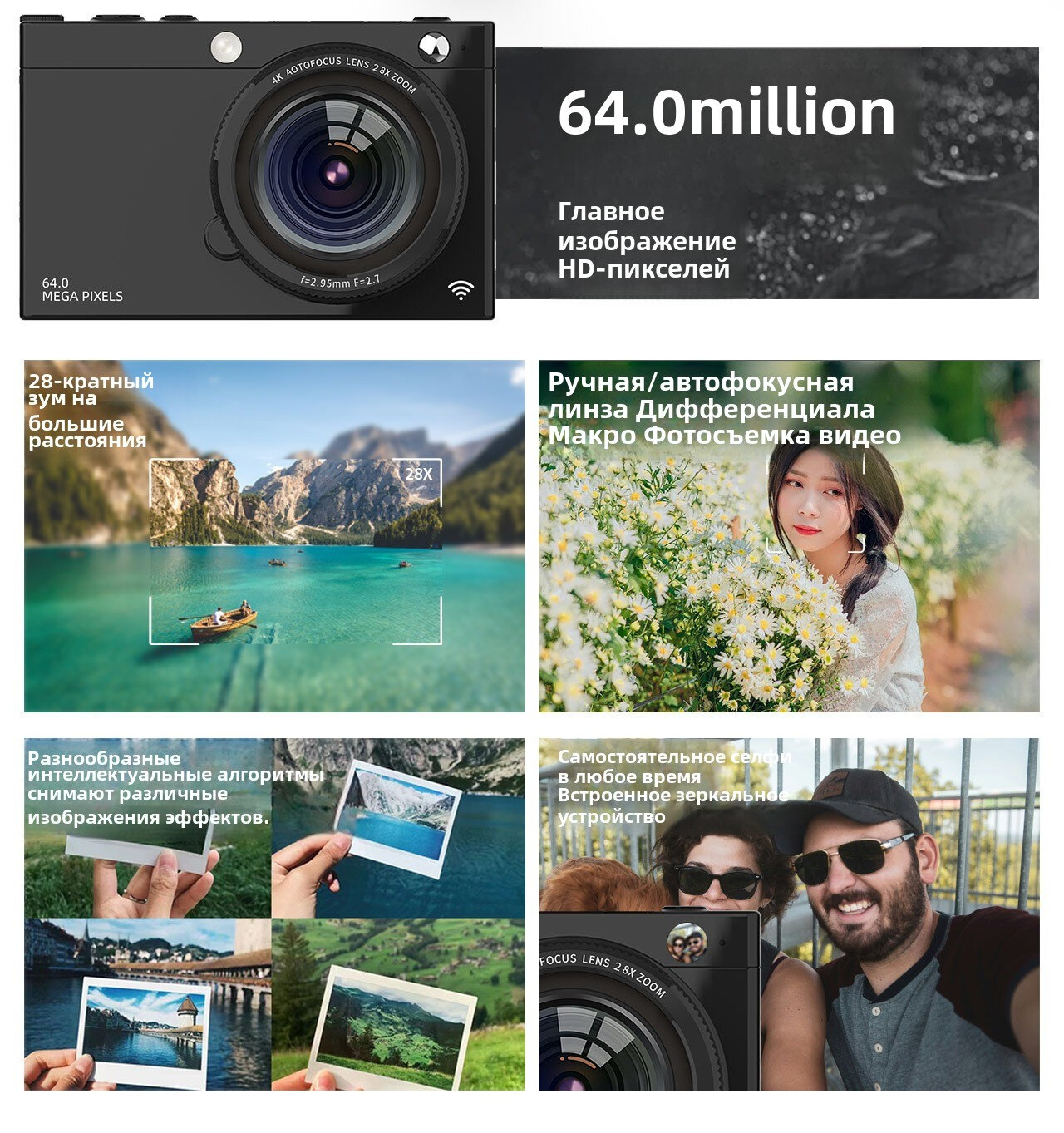 Купить Цифровой фотоаппарат 64Мп с Wi-Fi и экраном для блогеров и селфи с зумом 28X и картой памяти 128ГБ в комплекте