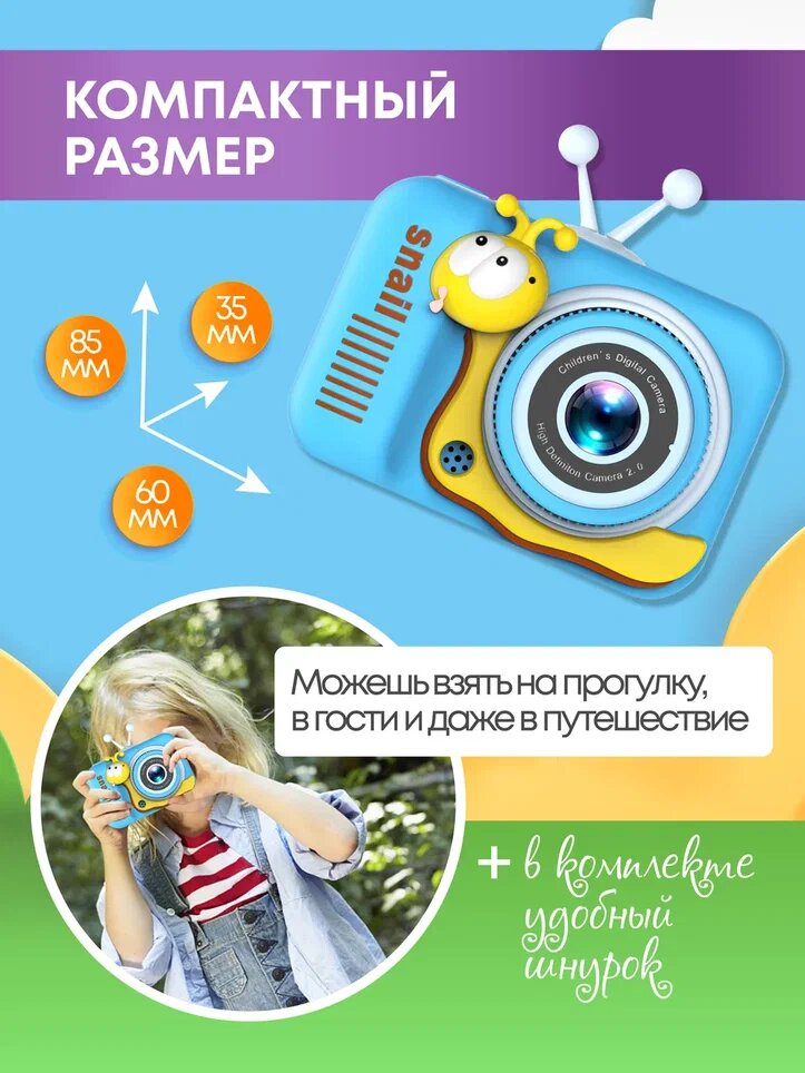 Фотоаппарат цифровой детский, улитка, голубой интересное: