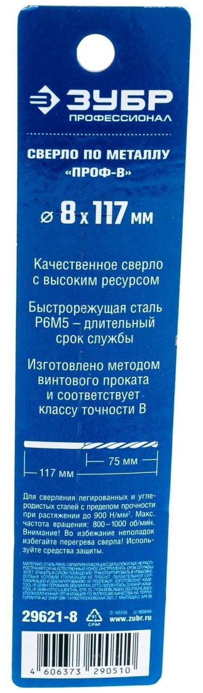 ЗУБР ПРОФ-в 8.0х117мм, Сверло по металлу, сталь Р6М5, класс В, 29621-8, Серия Профессионал