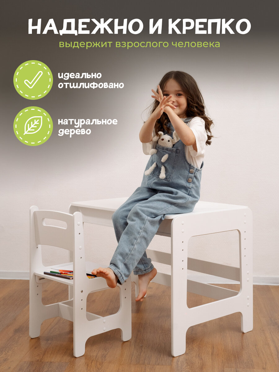 Детский растущий комплект СТОЛ и СТУЛ от "Pappado", на рост от 105 до 155 см, цвет белый + лак