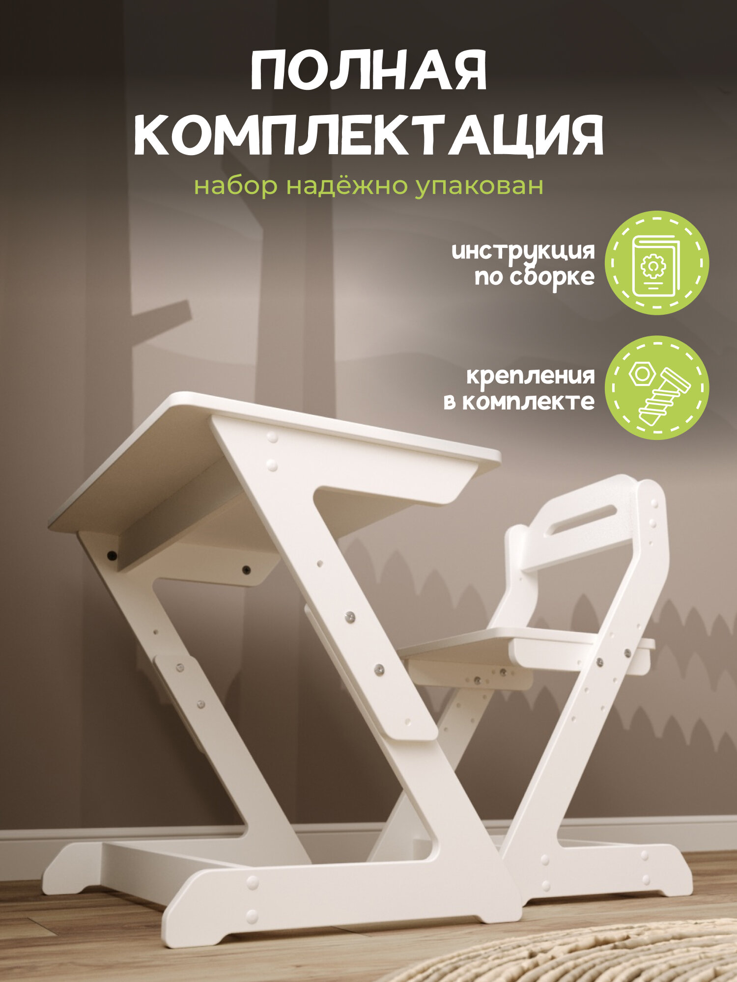 Детский растущий комплект СТОЛ и СТУЛ от "Pappado", на рост от 105 до 155 см, цвет белый + лак