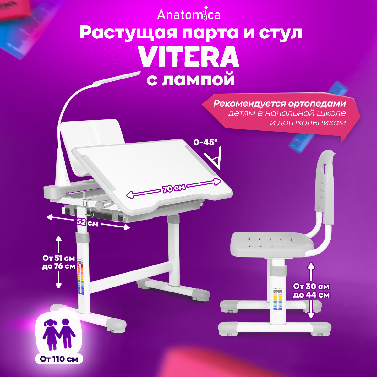 Комплект Anatomica Vitera парта + стул + выдвижной ящик + подставка + светильник белый/серый интересное: