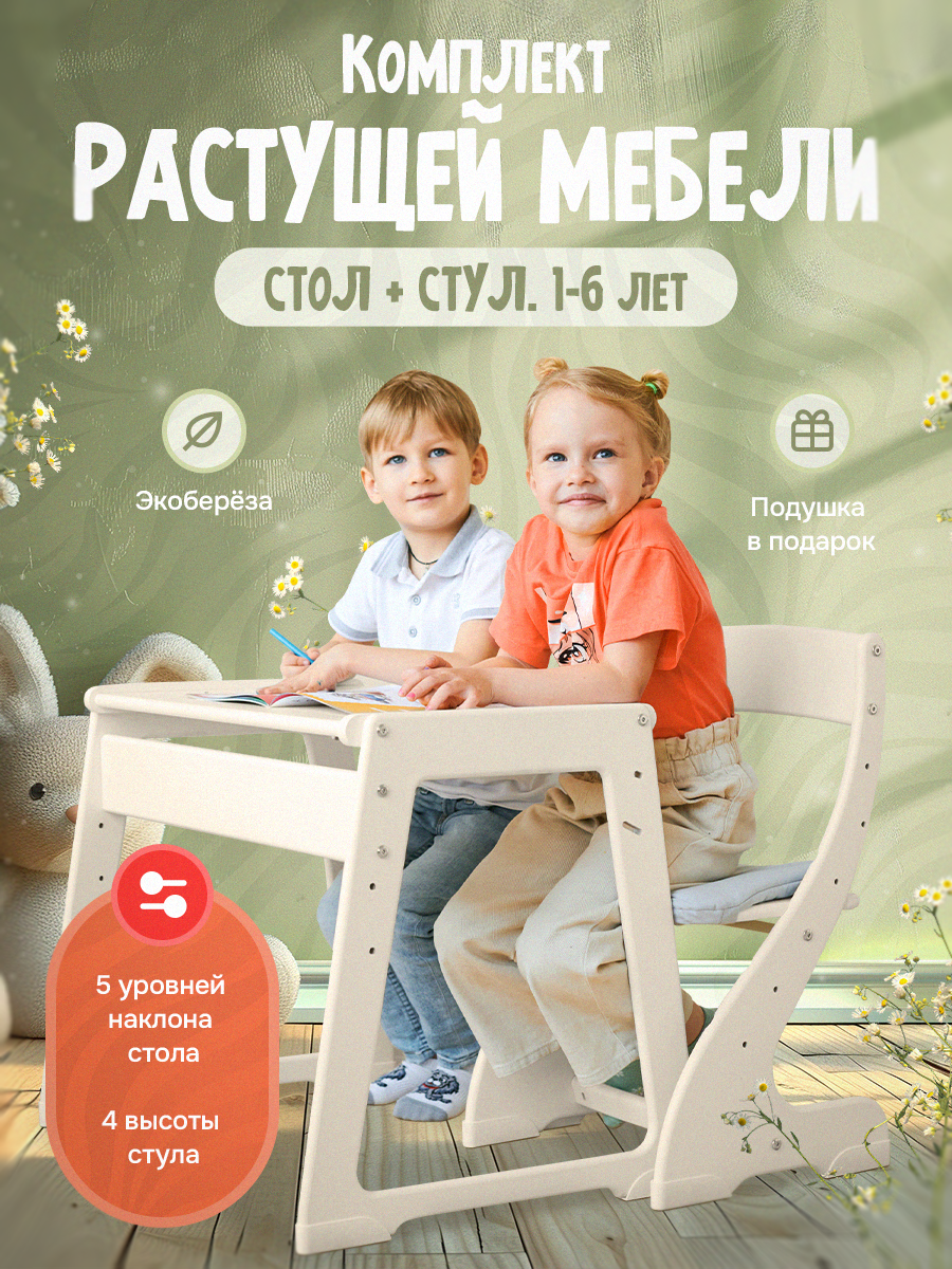 Комплект растущей мебели, детский стул и стол Друг Кузя слоновая кость подушечка звезды интересное: