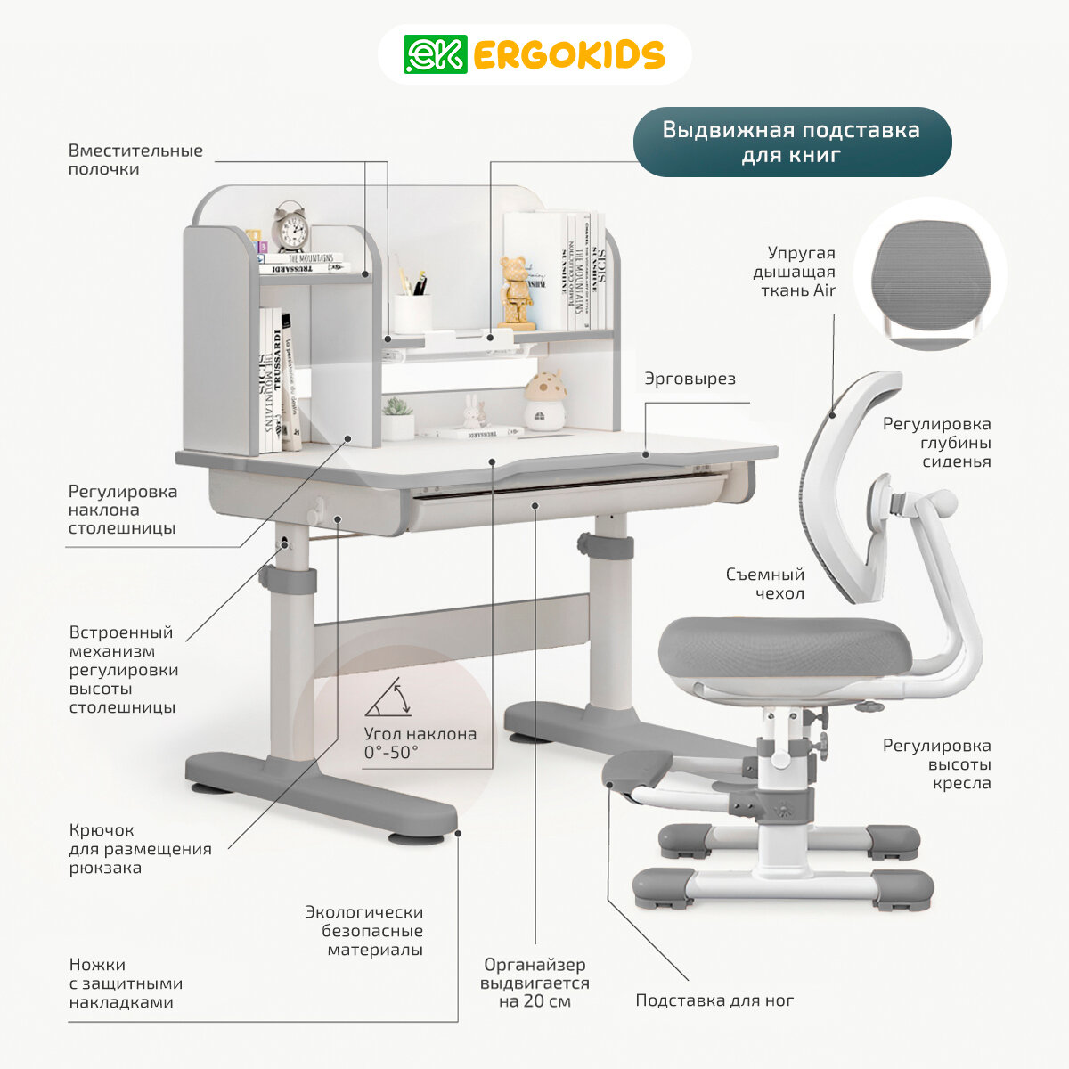 Растущий стол парта и стул детский набор Ergokids Umba BD-38 серый интересное: