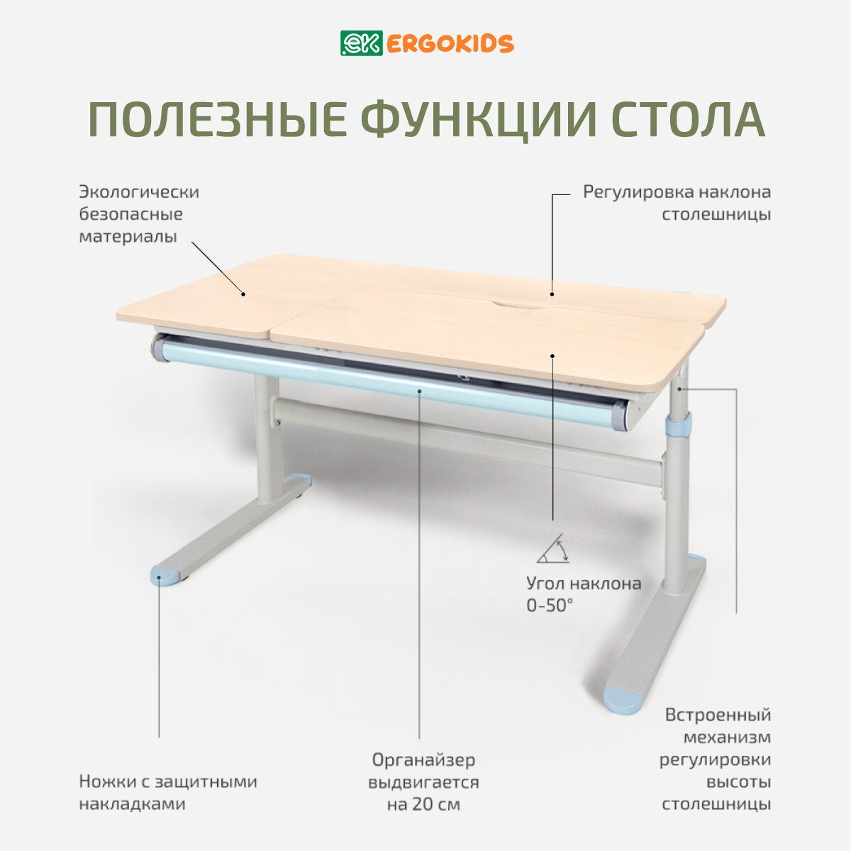 Купить Парта-трансформер Ergokids Bravo, с пеналом, ортопедическая, растущая, цвет клён/голубой, 120x60 см
