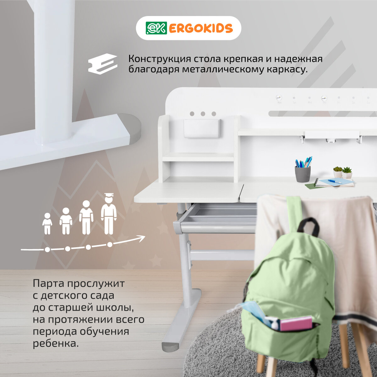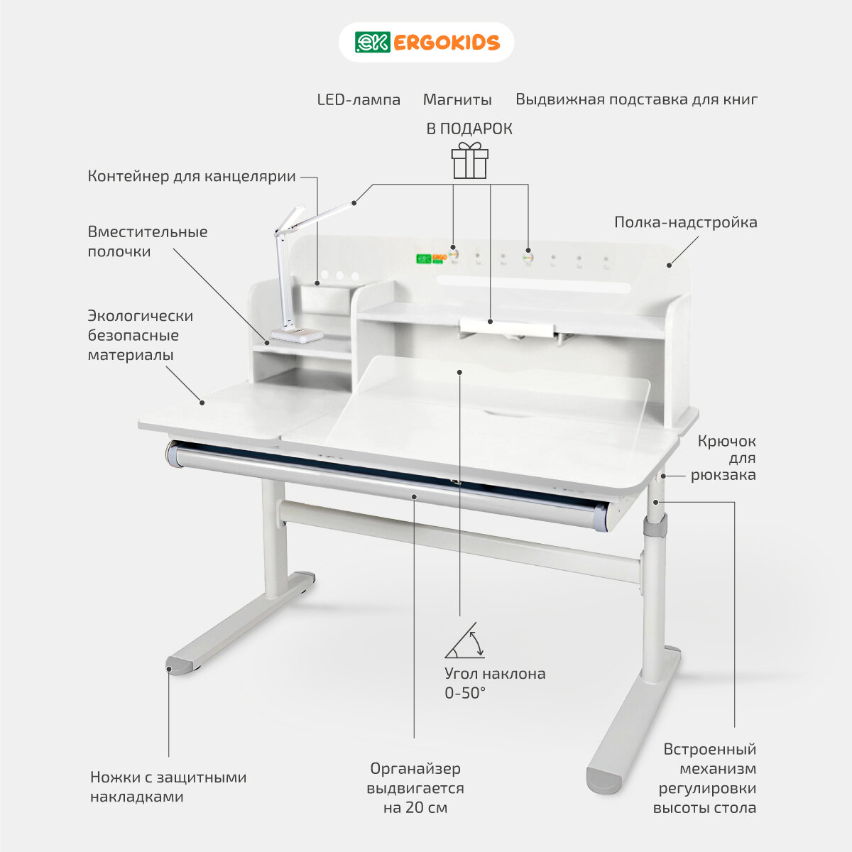 Купить Детский стол-парта Ergokids "Bravo Max", растущий, регулируемый, с магнитной доской белый/серый