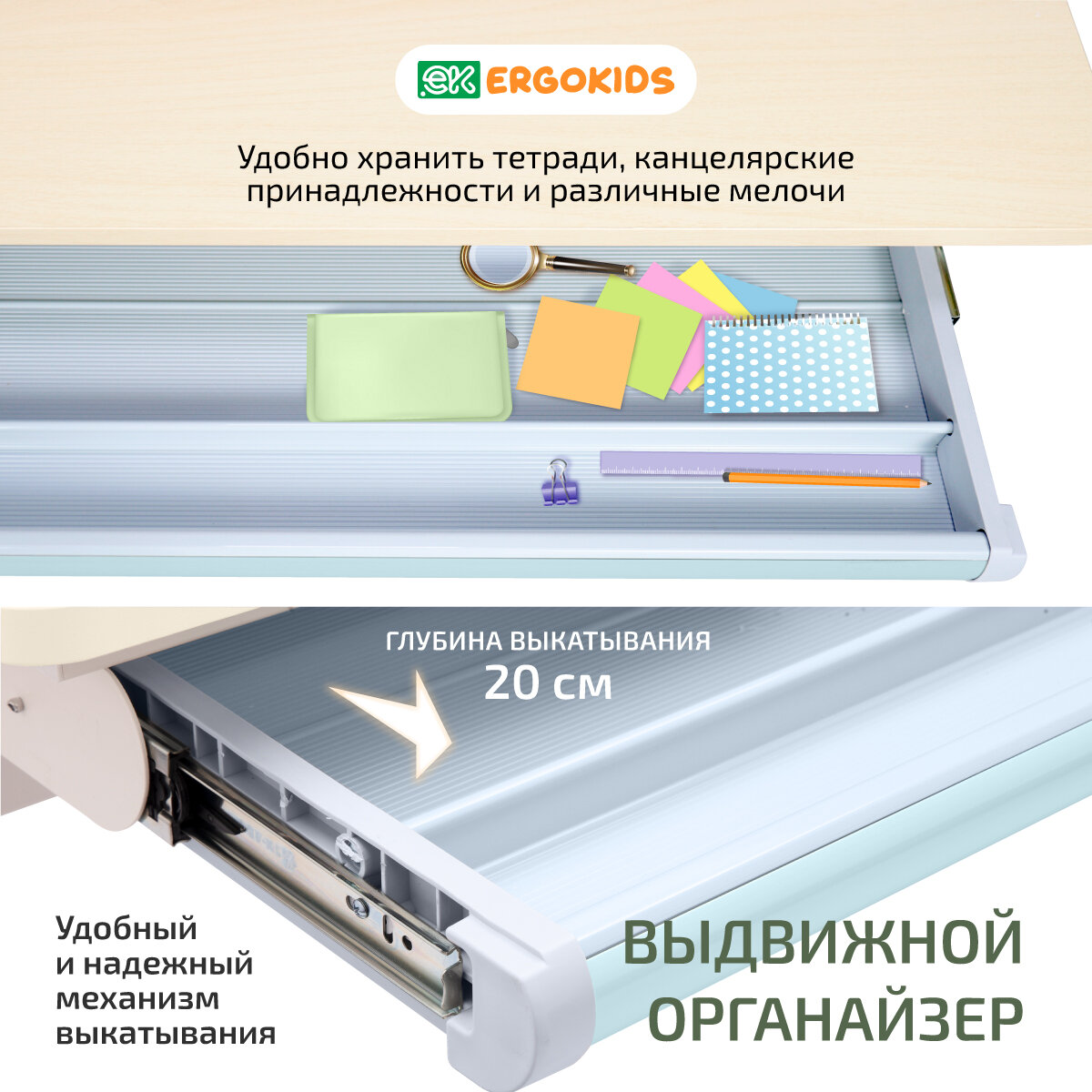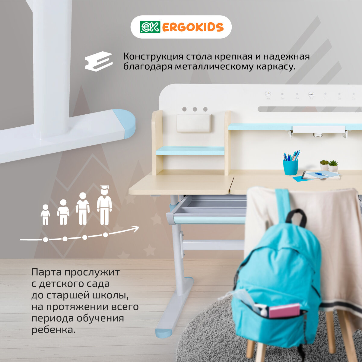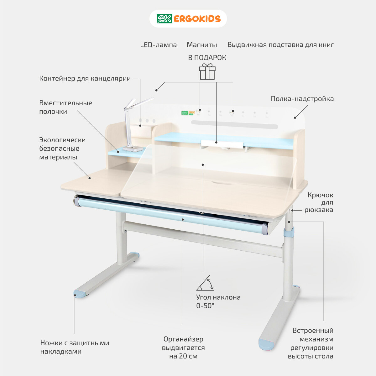 Купить Детский стол-парта Ergokids "Bravo Max", клен, синий, трансформер, с полкой, выдвижным пеналом клен\голубой