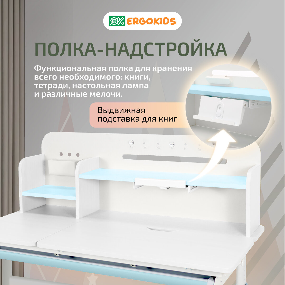 Детский стол-парта Ergokids "Bravo Max", клен, синий, трансформер, с полкой, выдвижным пеналом клен\голубой
