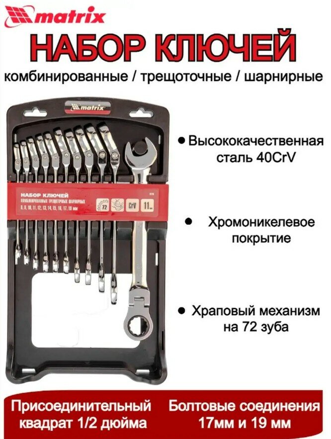 Набор ключей комбинированных, трещоточных шарнирных 11 шт. Matrix