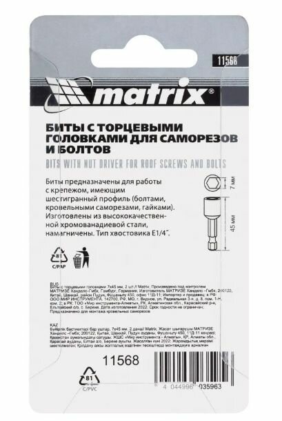 Биты с торцевыми головками 7 мм, 45 мм, 2 шт 1156811 Биты с торцевыми головками 7 мм, 45 мм, 2 шт MATRIX 4044996035963